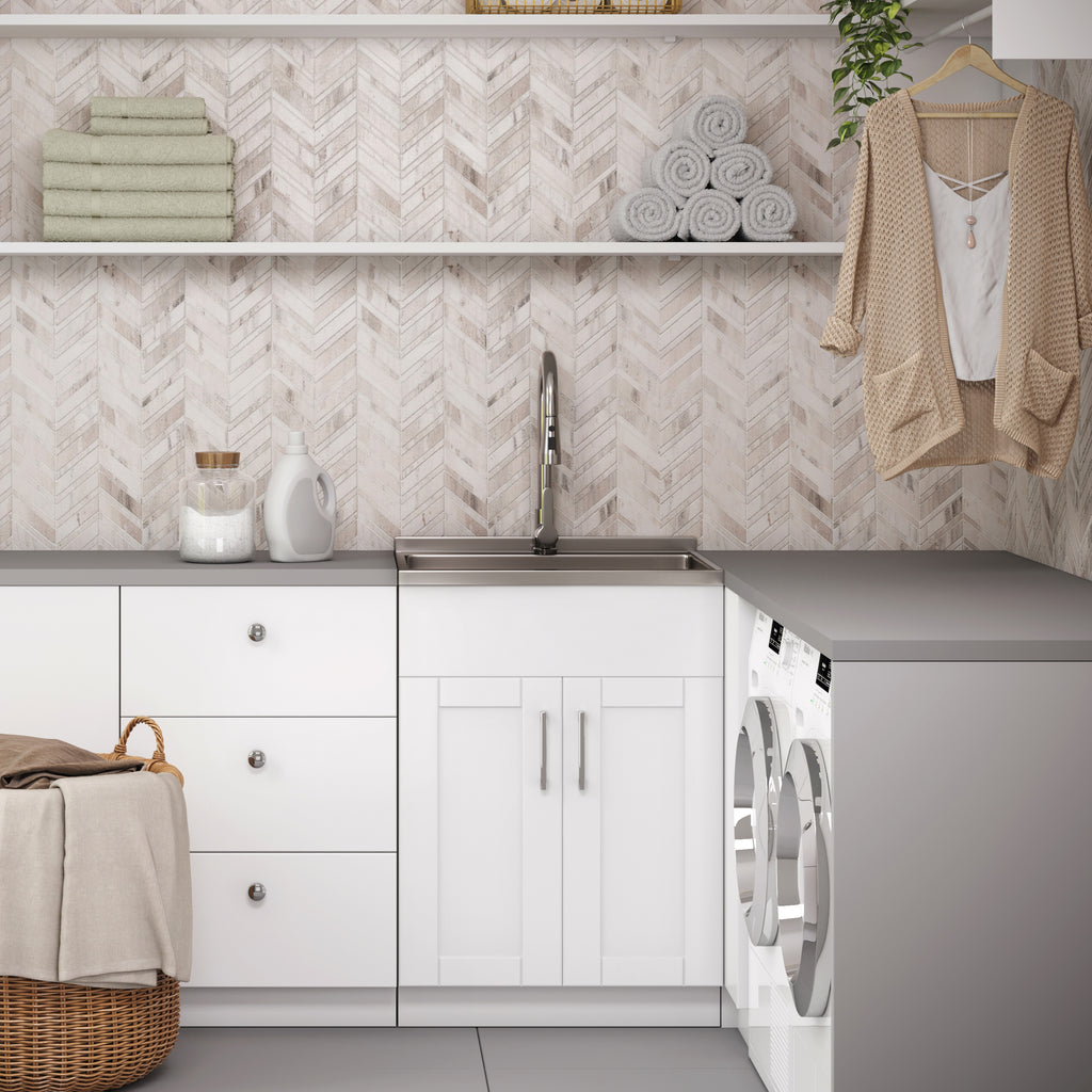 - Cabinet is constructed with melamine and doors are wrapped with PVC, materials that are highly durable, low maintenance, and water resistant