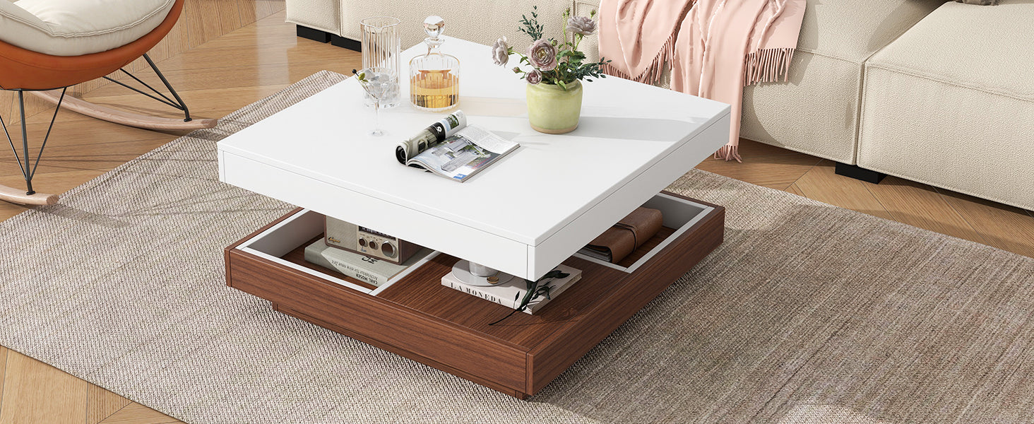 - The coffee table features a unique 360° rotating table top, combining style and functionality. Simply spin it to any angle you desire, effortlessly accommodating your storage and decorative needs. This versatile design ensures easy access to items from all sides, making it a truly practical and stylish addition to any space.