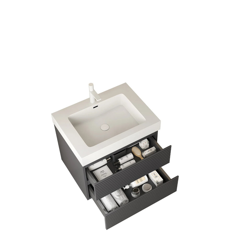 The cabinet drawer panel is made of skin-like matte gray paint with striped.