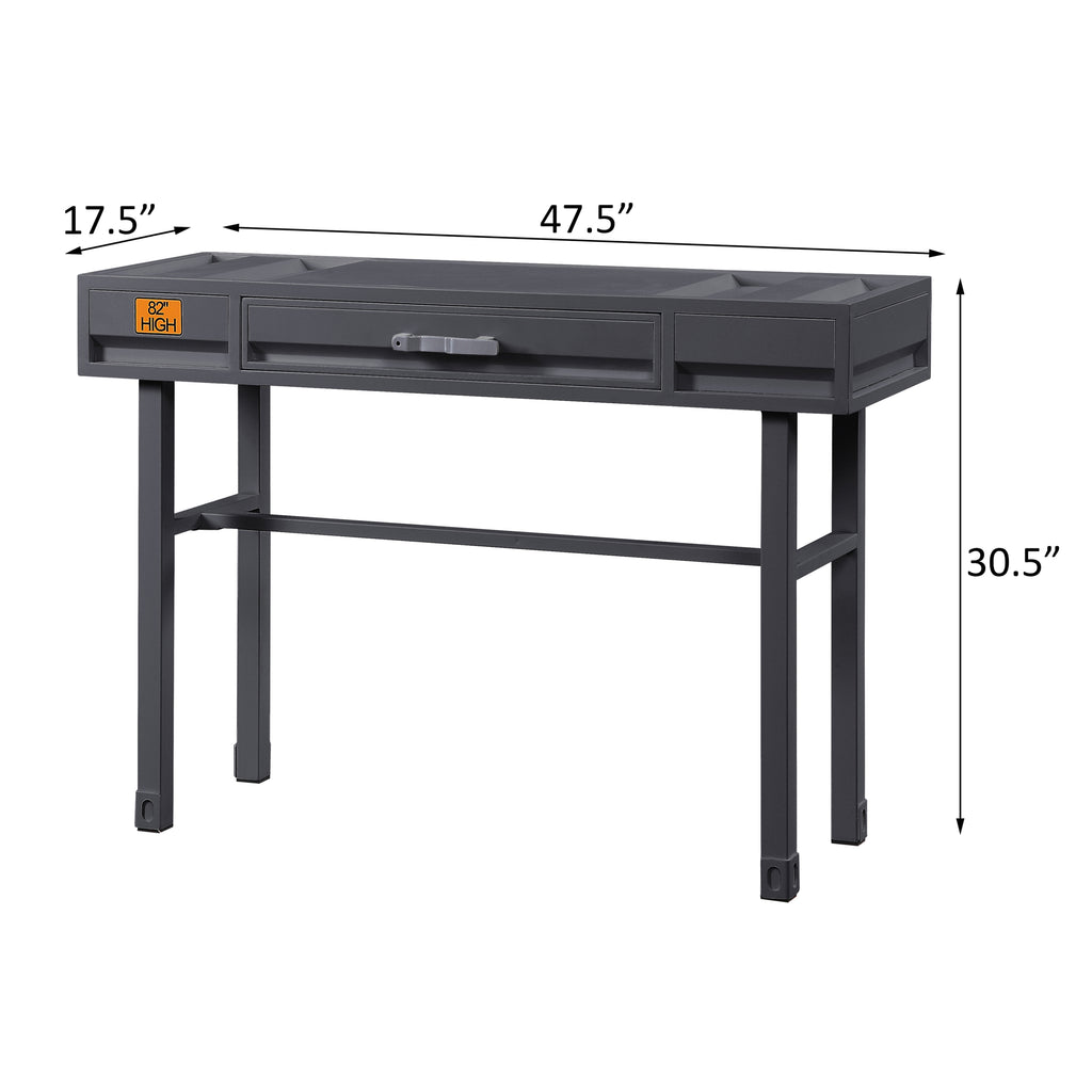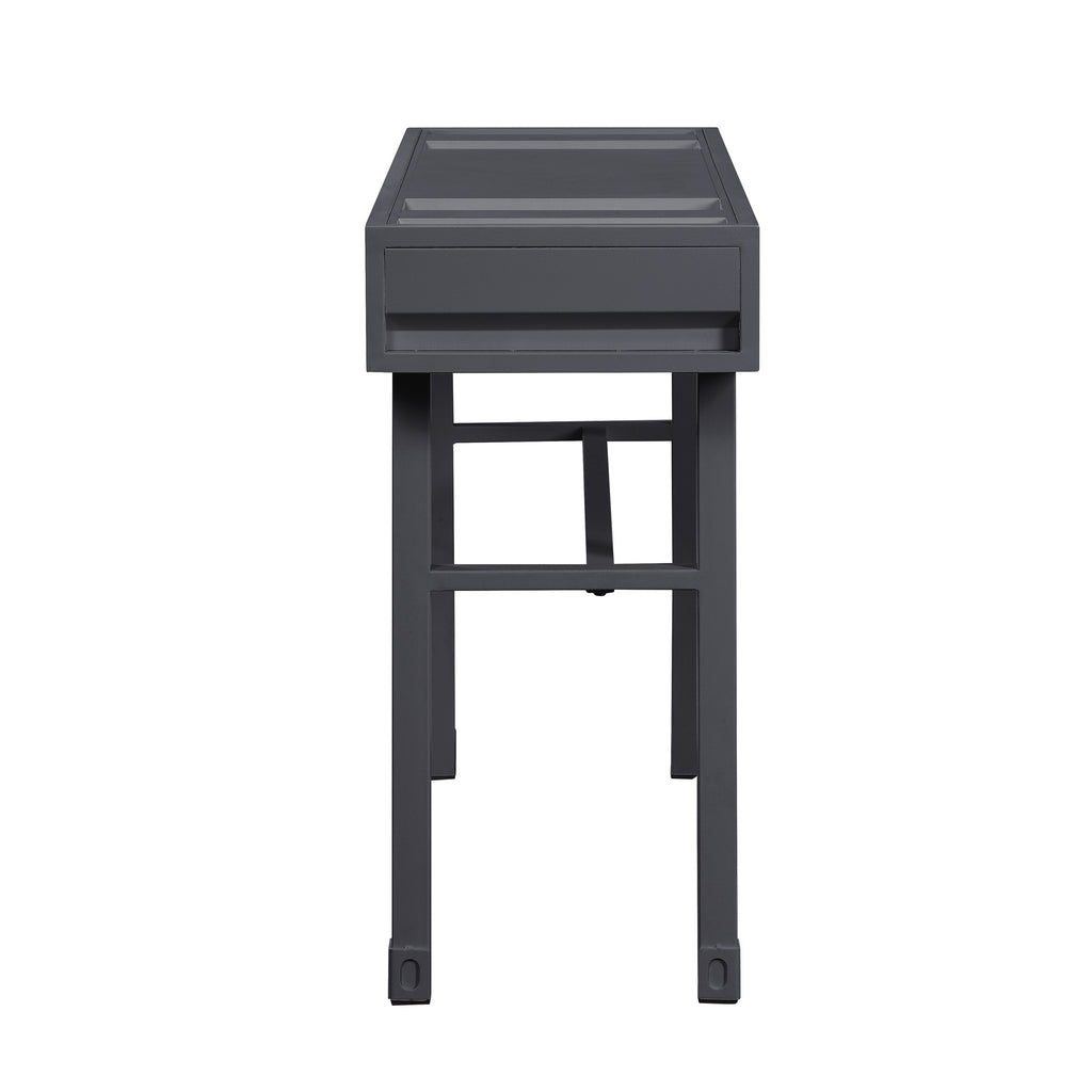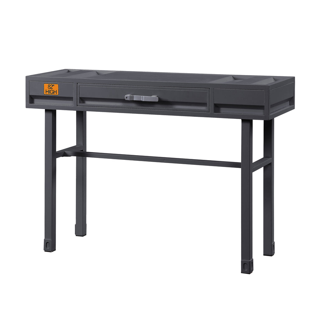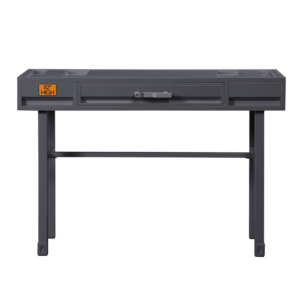 Inspired by cargo container style, this writing desk brings a distinct industrial vibe to your workspace with its functional and unconventional design. The desk features a recessed panel design for visual interest, a drawer with a safety stop for secure storage of office essentials, and adds a unique, eye-catching element to any room.