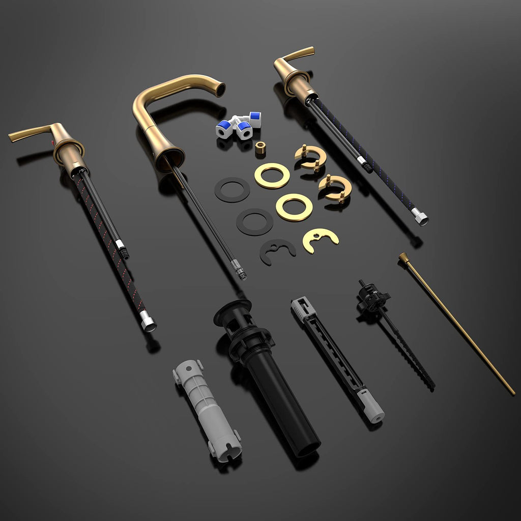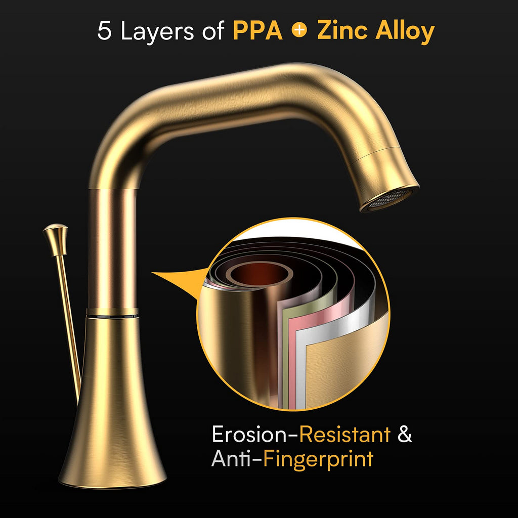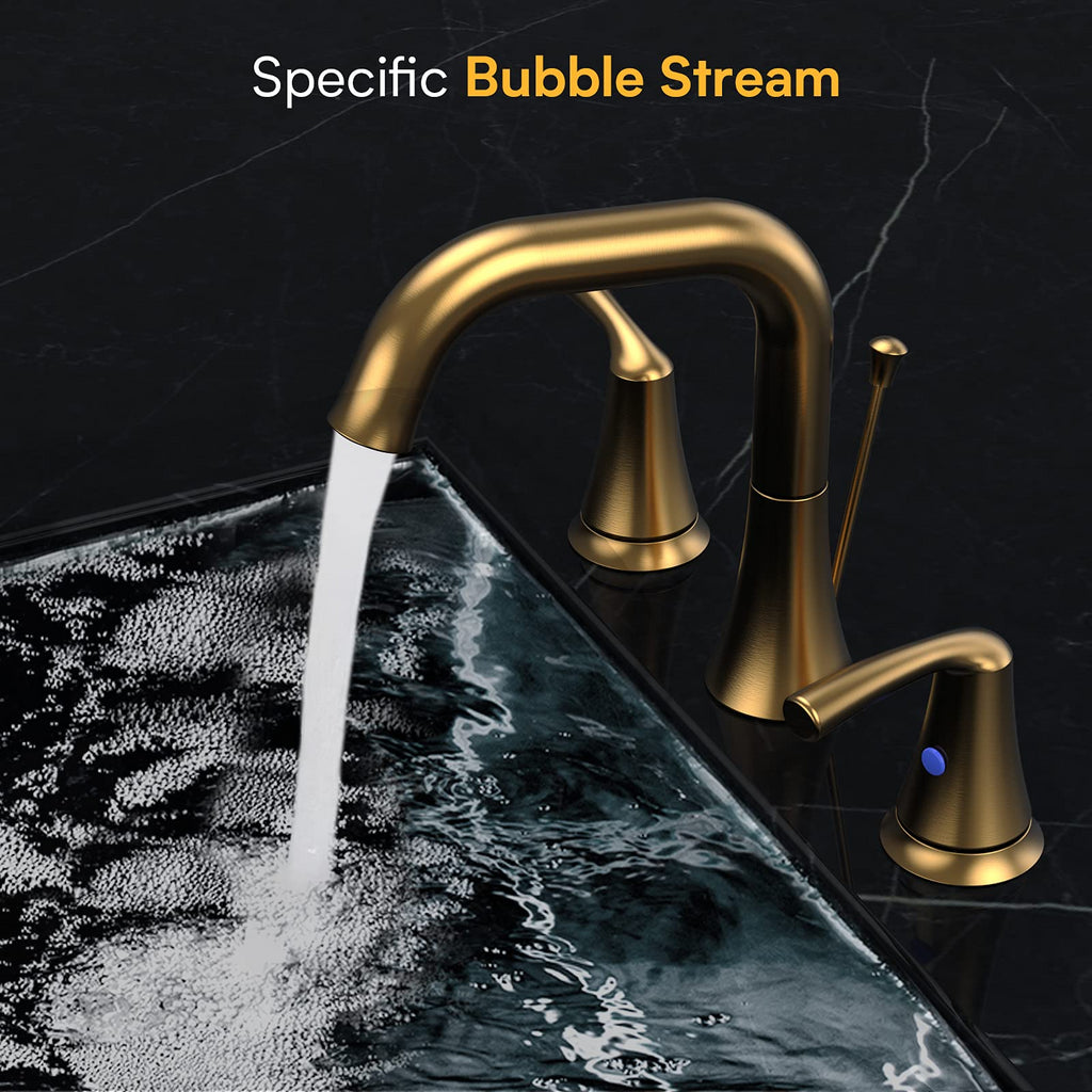 - Brushed Gold Finish and Extremely durable material- Brushed Gold coating of the bathroom faucet allows the resist corrosion, rust, scratching, suitable for different bathroom decoration styles and bring a sense of luxury. All the metal connector parts and high-performance ceramic valves of the bathroom faucet 3 hole have high durability assurance, 100% Lead-Free.