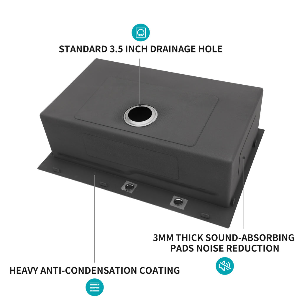 - [Coating and Silencer Pad]There is a thick coating on the outside of the sink to prevent condensation caused by weather changes. In addition, the 3mm thick rubber silencer pad can greatly reduce the noise from the faucet and give you a quieter cooking environment.