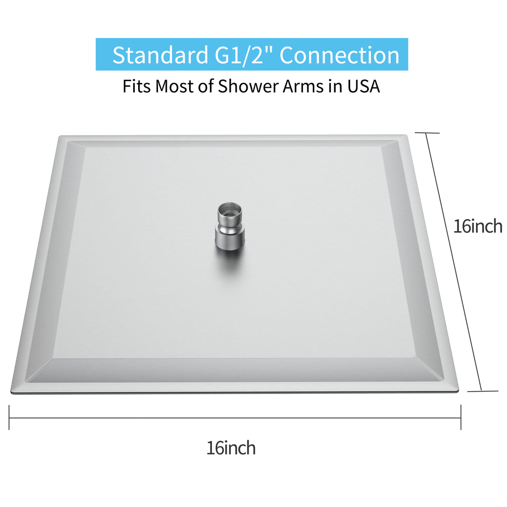 - 16 inch Large Rain Shower Head: Extra large for full-body body shower,keep your every skin bathing in warm water. The rainfall shower head with air energy technology to compensate for low water pressure situation to output water at a higher velocity, Recommended water pressure: 0.31 Pa above. 16'' supper large size, brings you 100% full-body High pressure shower.