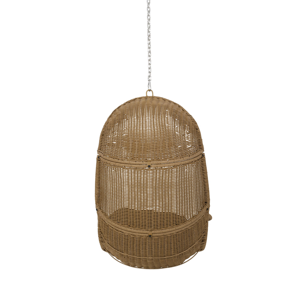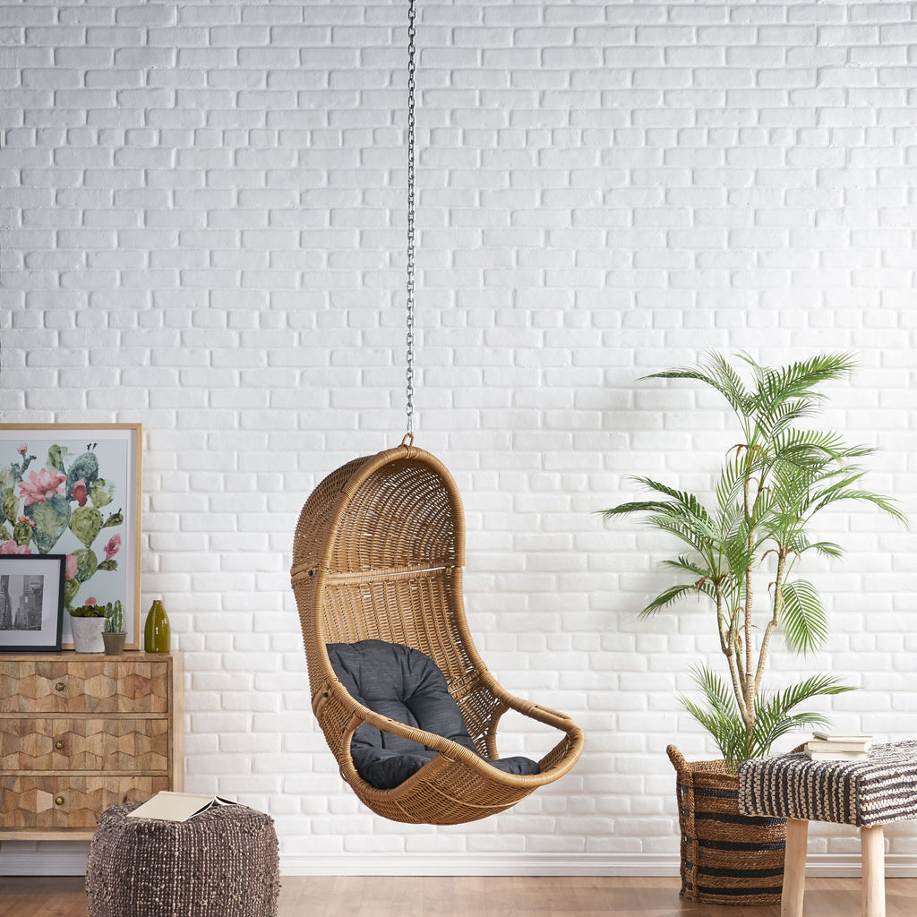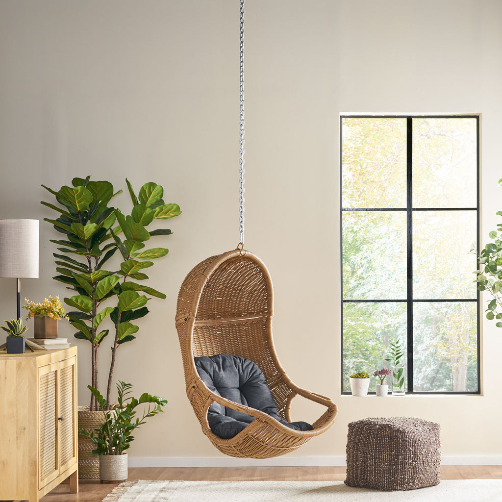 Ultimate comfort is just a step away with an accessory that is sure to impress your guests. Featuring a charming basket shape, this charming accessory not only gives your space a refreshing transitional look but also offers incredible comfort. This is constructed with beautifully wrapped wicker weave and a sturdy metal frame, allowing you hours of much-needed leisure whenever you need it. Finished with plush water-resistant cushions, this piece can be used both indoor and outdoor, making this a truly extraordinary addition to your lounge area. Not Included: Hanging Stand, Mounting Hardware Material: Faux Rattan Frame Material: Iron Cushion Material: Water Resistant Fabric Cushion Composition: 100% Polyester Finish: Light Brown Multiple Cushion Color Options Assembly Required Dimensions: 33.00 inches deep x 30.20 inches wide x 44.00 inches high