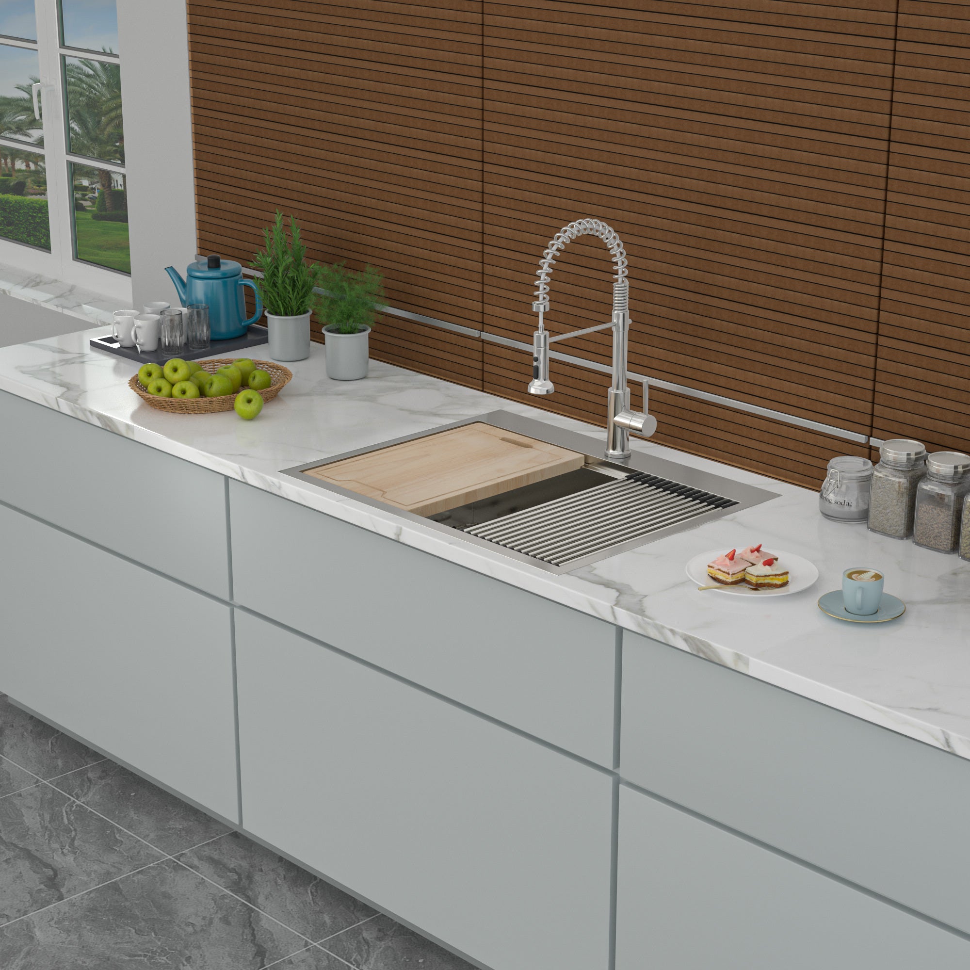 - FUNCTIONAL Single Basin Workstation Kitchen Sinks, Ledges on the front and back provide a track, the track provides us with more space to use. It can be switched to a cutting board or a separate sink mode. If you don't want to wash the dishes, the cutting board covers the entire sink and also covers your dirty dishes.