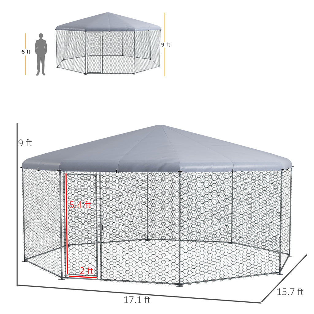 - Chicken Pen Info: Overall Dimensions: 17' x 15.7' x 9'. Door Dimensions: 2W x 5.4H ft. Assembly required.