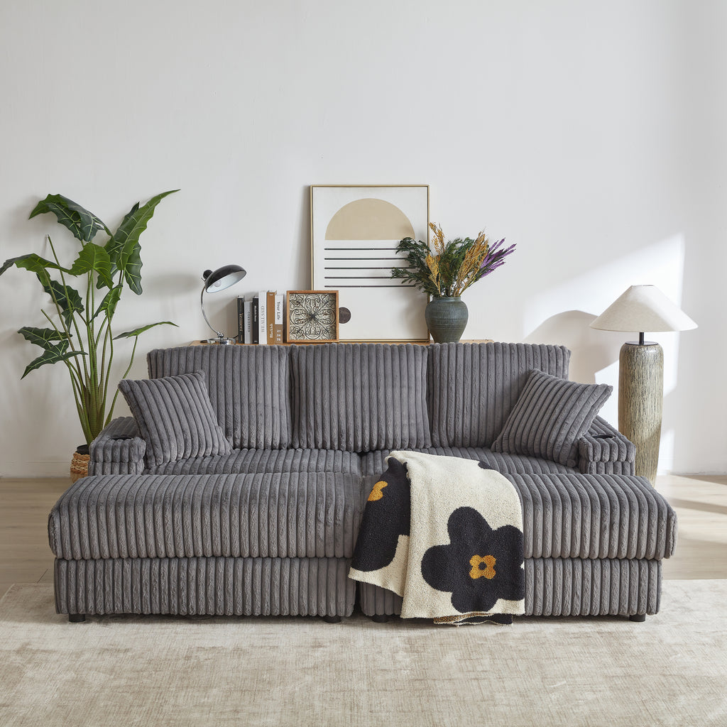 Product Name. corduroy sofa Sofa leg material: plastic Overall Size. Please refer to the picture Detailed dimensions. Please refer to the picture Package size. Please refer to the description Package weight (lbs.). Please refer to the description Product weight (pounds). Please refer to the description Does the product contain pillows: Includes 3 back pillows(55*39*19) and 2 toss pillows(36*36*19) Load capacity: 250lbs/seat Assembly required: Required (Please refer to the description) Frame material: solid wood + plywood Seat structure: foam Country of origin. China Note: Manual measurements have been used and there may be some reasonable errors. All pictures are taken from actual samples and may have slight color differences due to lighting or monitor.