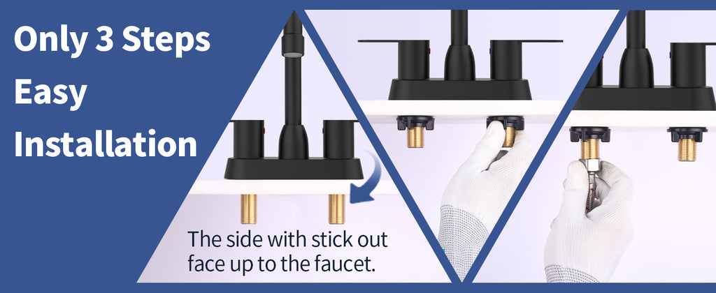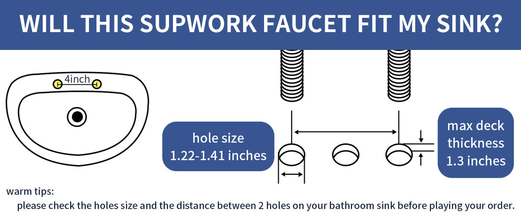 - Easy to install—— 4 inch centerset bathroom faucet design, Includes matching finish pop-up drain assembly. With step-by-step instruction, easy to install by yourself within half an hour. Whether you’re a first timer just learning how to install a faucet for bathroom sink or a seasoned installation professional, save your back and your knees with the supwork two handle bathroom faucet mounting assembly.