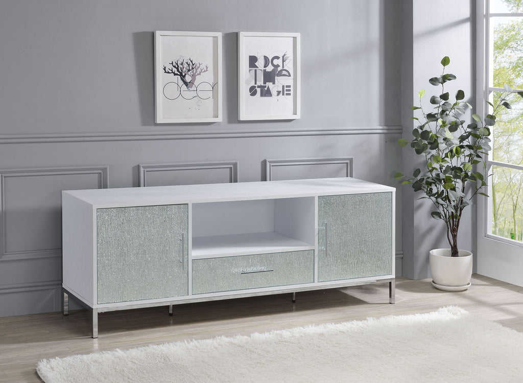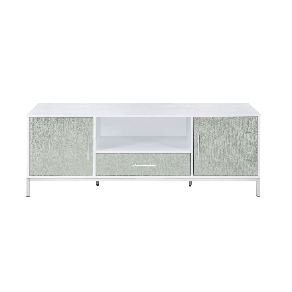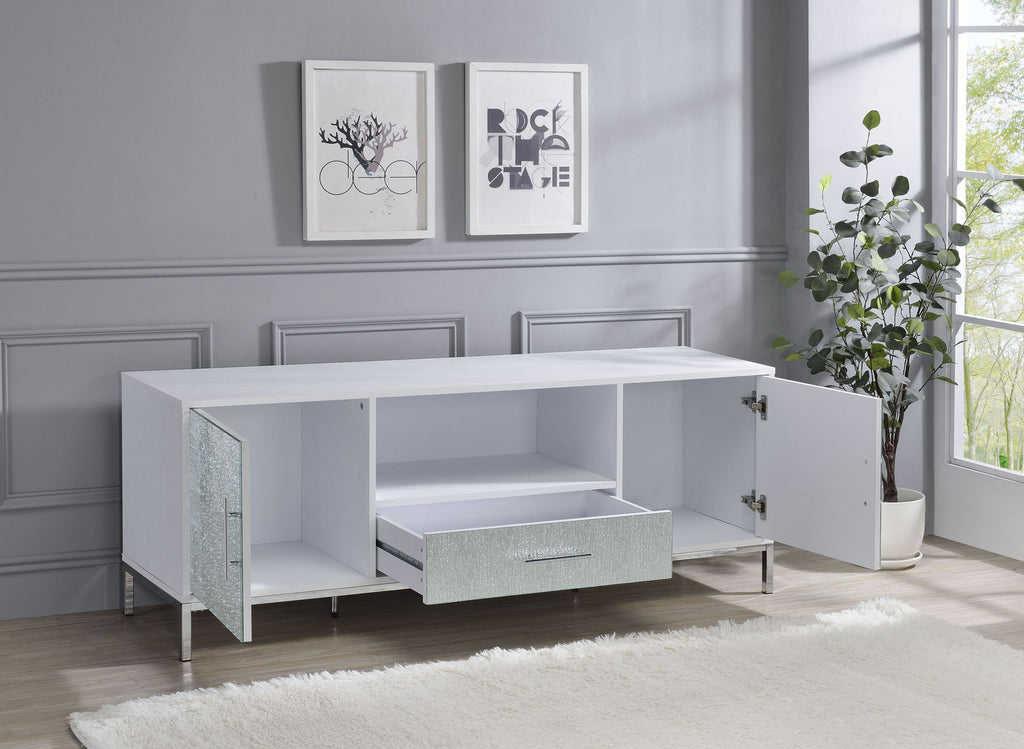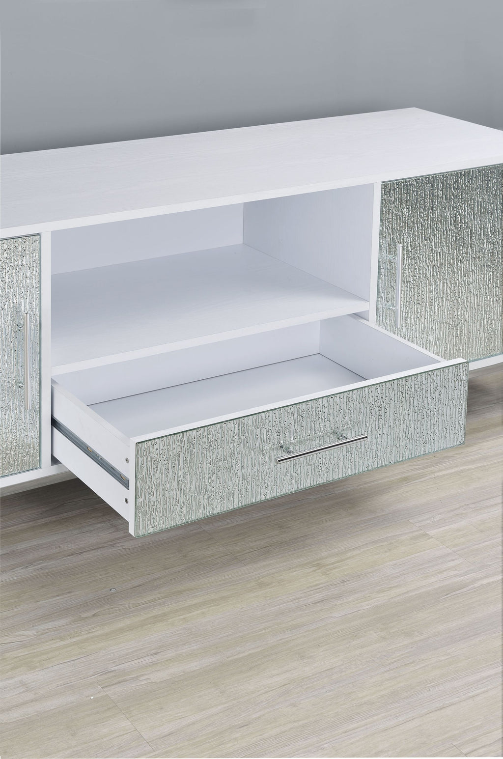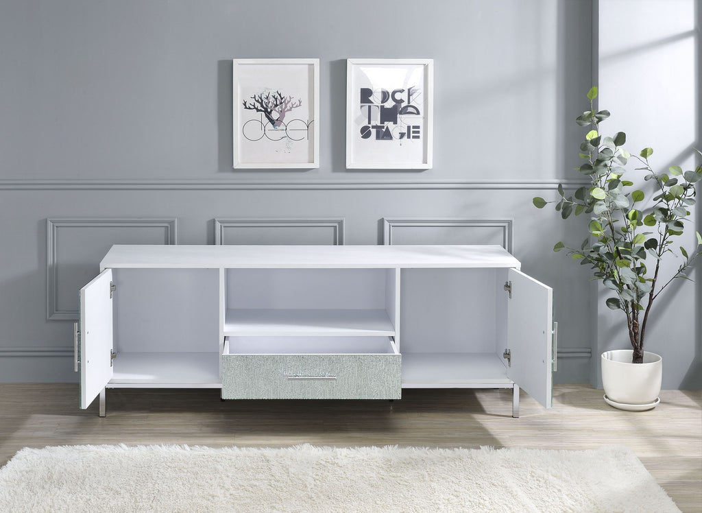 - Open storage area for cable box, game systems or other electronics features wire management system