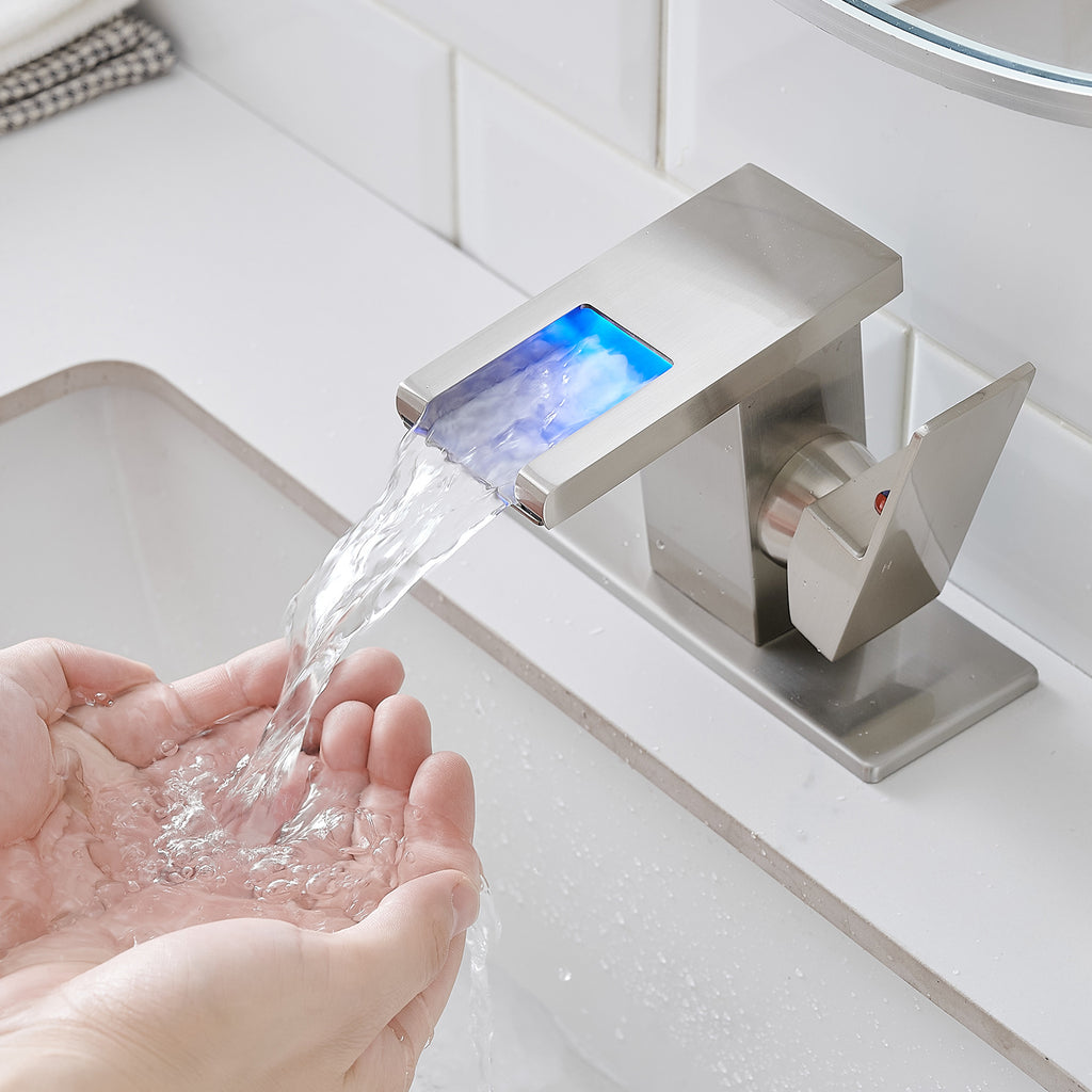 LED Light Bathroom Sink Faucet for 1 Hole Waterfall Brushed Nickel Single Handle Bath Faucets