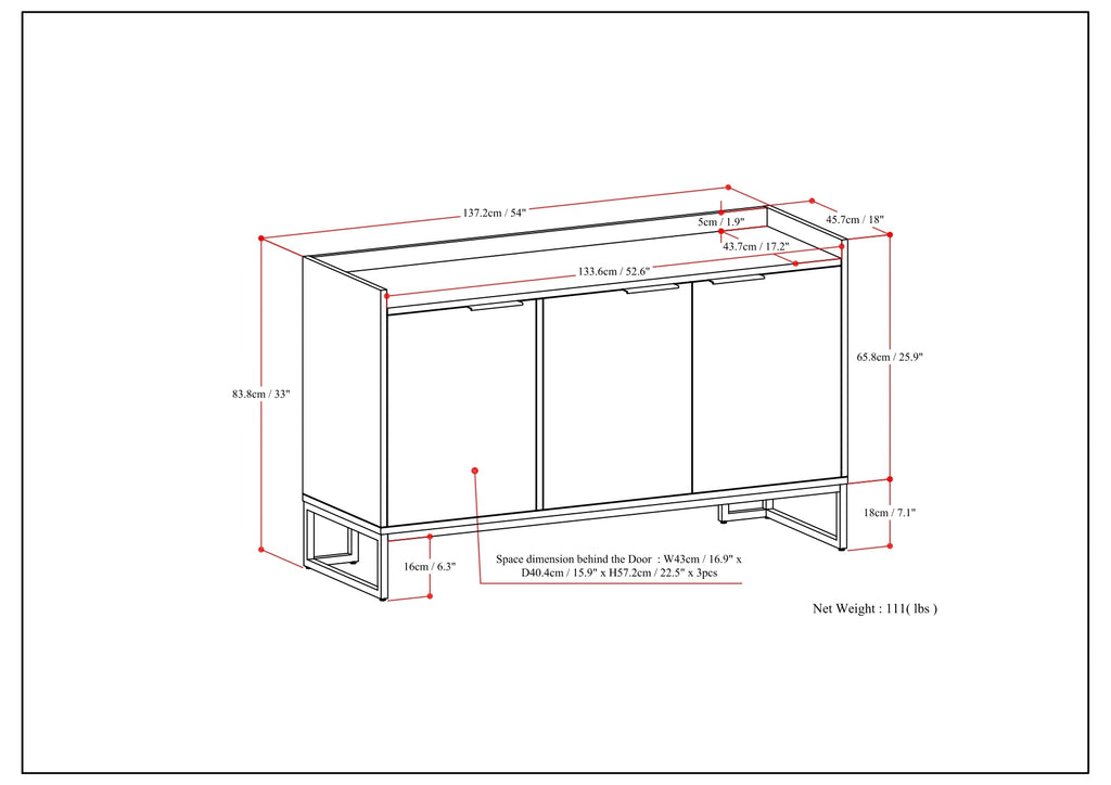 - Features three (3) adjustable shelves, three (3) Doors include concealed all-metal hinges and magnetic door catches