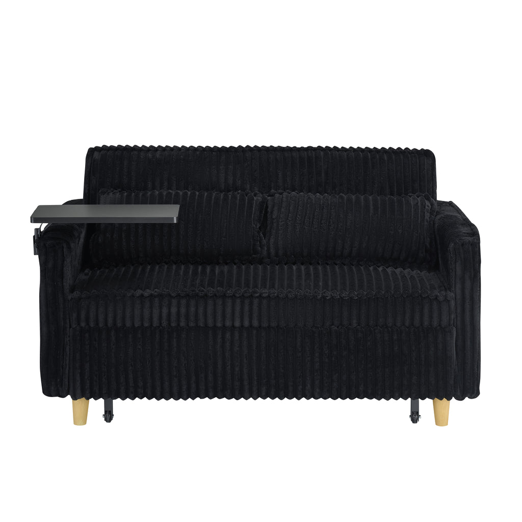 The sofa is made of black corduroy that feels smooth, warm and skin-friendly, and it looks calm and elegant. Its unique pull-out and push-in design is truly remarkable. With smooth rollers installed at the bottom, you can easily slide the sofa out with just a gentle push and instantly turn it into a spacious and comfortable bed, breaking the functional limitations of traditional furniture with its flexible and changeable features.One side of the armrest is cleverly equipped with a movable tabletop, allowing you to enjoy a meal while binge-watching your favorite shows or handle urgent work tasks when working from home. Additionally, a USB port is thoughtfully placed on the right side of the sofa. So when you're lying on the sofa watching dramas or playing games, you no longer have to worry about your phone running out of battery. You can charge it at any time and enjoy uninterrupted entertainment, fully immersing yourself in a cozy and relaxing leisure time.