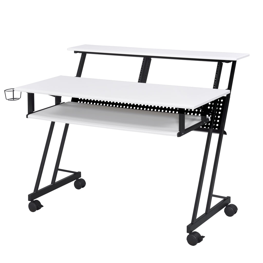 - The keyboard stand features a wooden top, shelf, and keyboard tray, providing ample space for placing a music keyboard (recommended size: 61 keys) and additional accessories such as sheet music or audio equipment