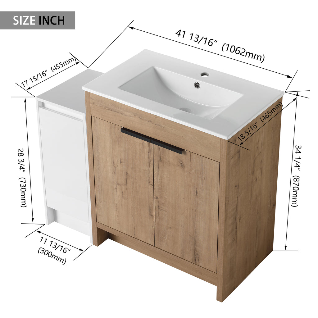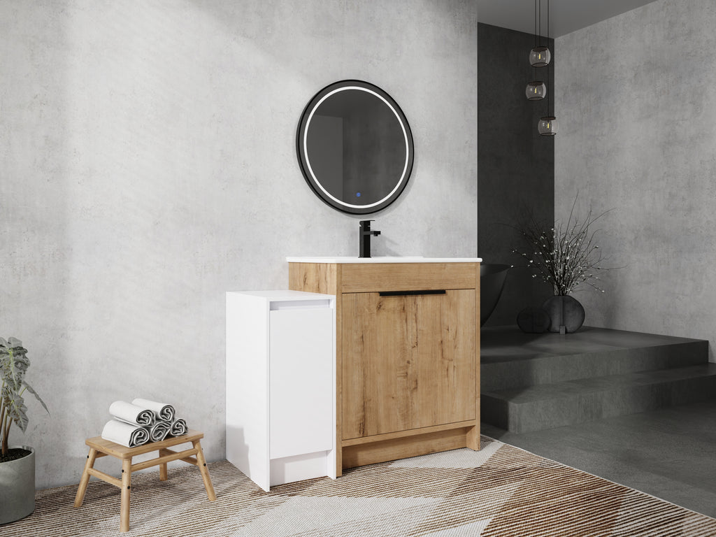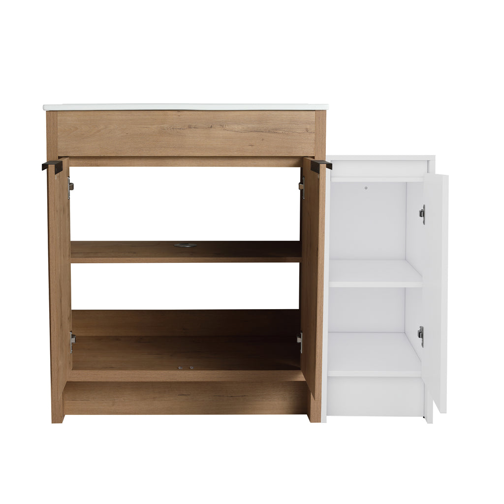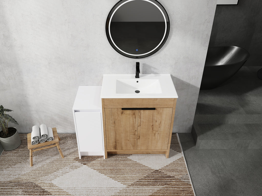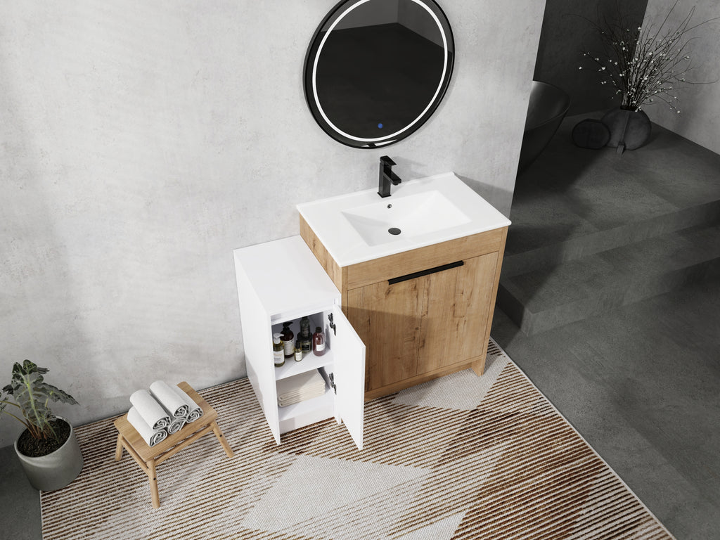 This freestanding bathroom combination cabinet not only boasts strong functionality but also incorporates a modern minimalist design, seamlessly blending with the overall decorative style of the bathroom. The integrated design of bathroom cabinet and basin makes the product more concise and elegant. The vanity of the bathroom and the storage cabinet are both equipped with adjustable shelves, which can provide classified placement of daily necessities for the bathroom. The additional combination of independent small storage cabinets provides a lot of extra space for the bathroom.