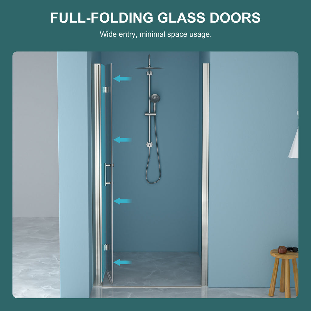 - Bi-Fold Frameless Shower Door: This shower door is 36 in. W x 72 in. H; Premium 1/4 inch (6 mm) thick tempered clear glass. Water-resistant Screen Defends Against Limescale, Ensuring Long-Lasting Cleanliness.
