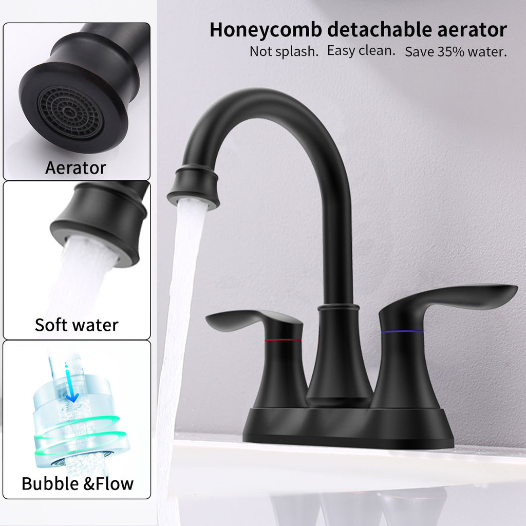 - ?【 WATER EFFICIENT 】- The ABS aerator of 3-hole mount 5 inch centerset bathroom sink faucet imported strengthens the foaming effect of the dense, the water flow is dense and soft without splashing,improve water efficient. Detachable aerator, you can clear hard water blockage at any time. Suitable for rent house, new condo, single-apartment, motor home, travel trailer and family use.