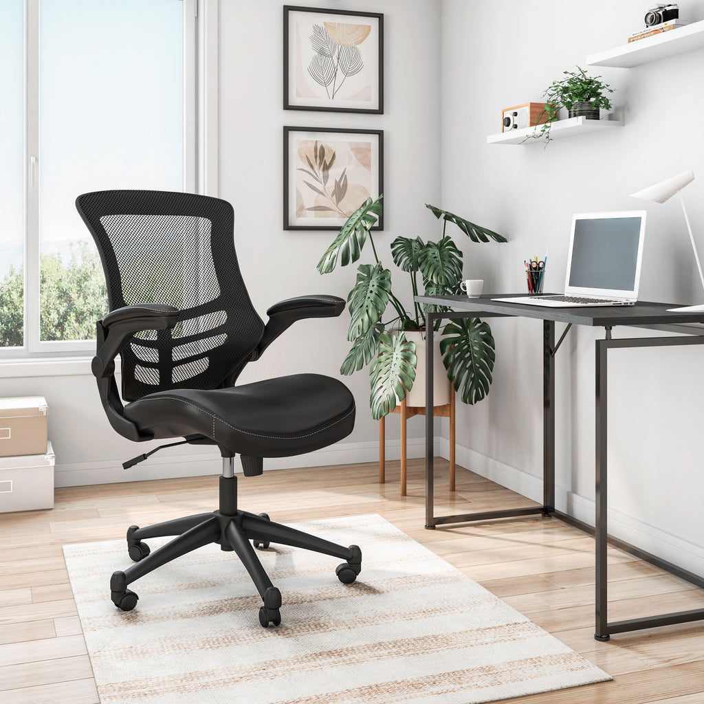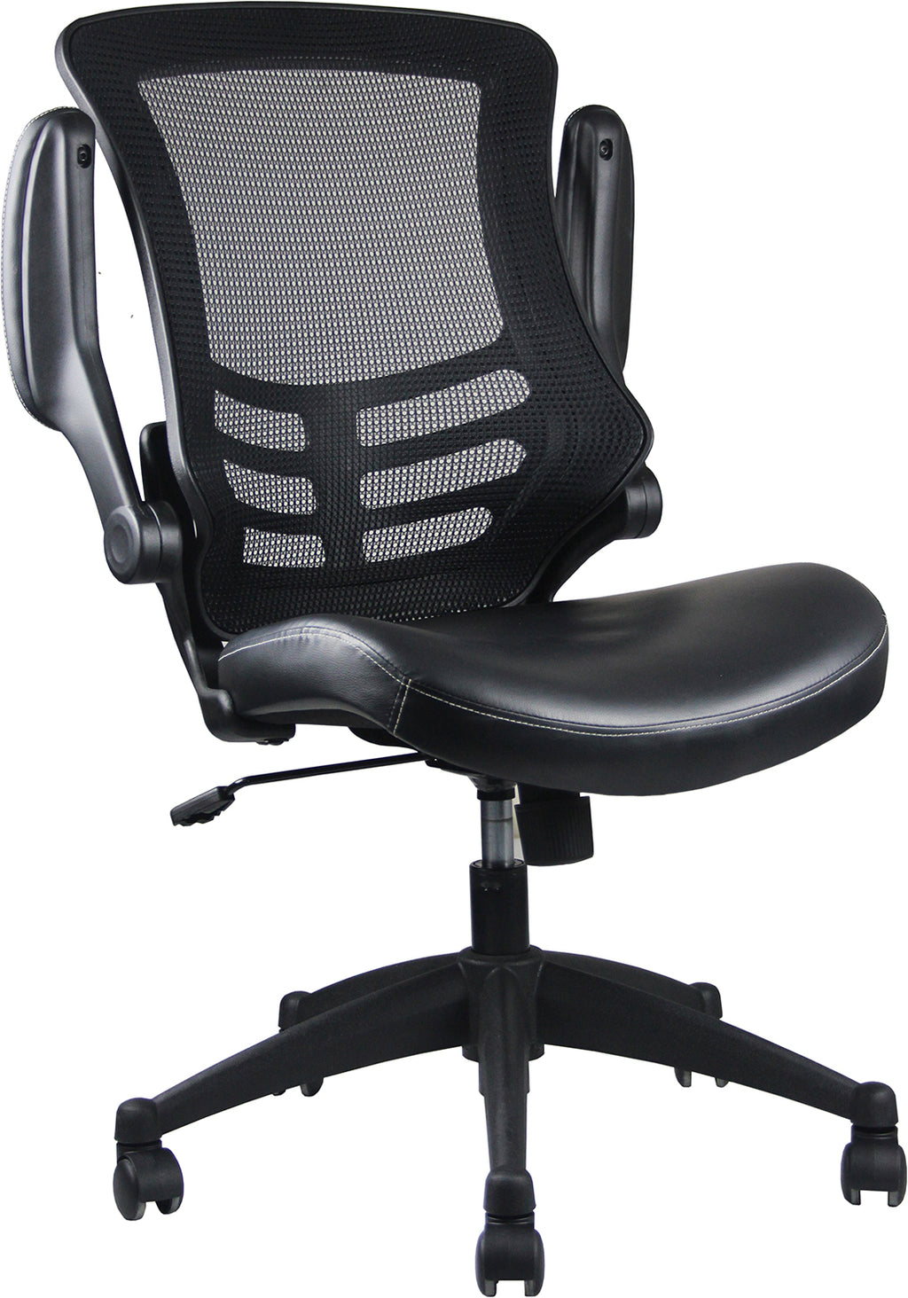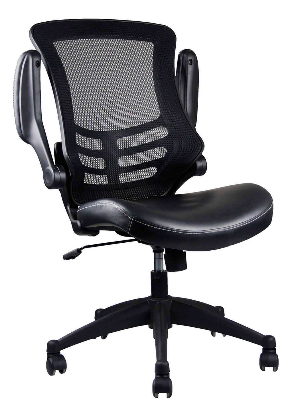 This Techni Mobili Stylish Mid-Back Mesh Office Chair is a modern seat made of TechniFlex upholstery, has many features such as padded flip-up armrests, pneumatic seat height adjustment and a tilt tension control for reclining. Can comfortably fit people with up to 220lbs. Sits on large durable nylon base with non-marking nylon casters. It is ready and easy to assemble. Color: Black