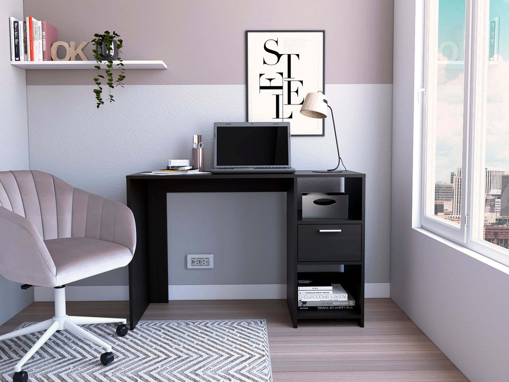 - The desk is finished in a sleek black, light gray, or smokey oak manufactured wood, adding a touch of sophistication to your home office.