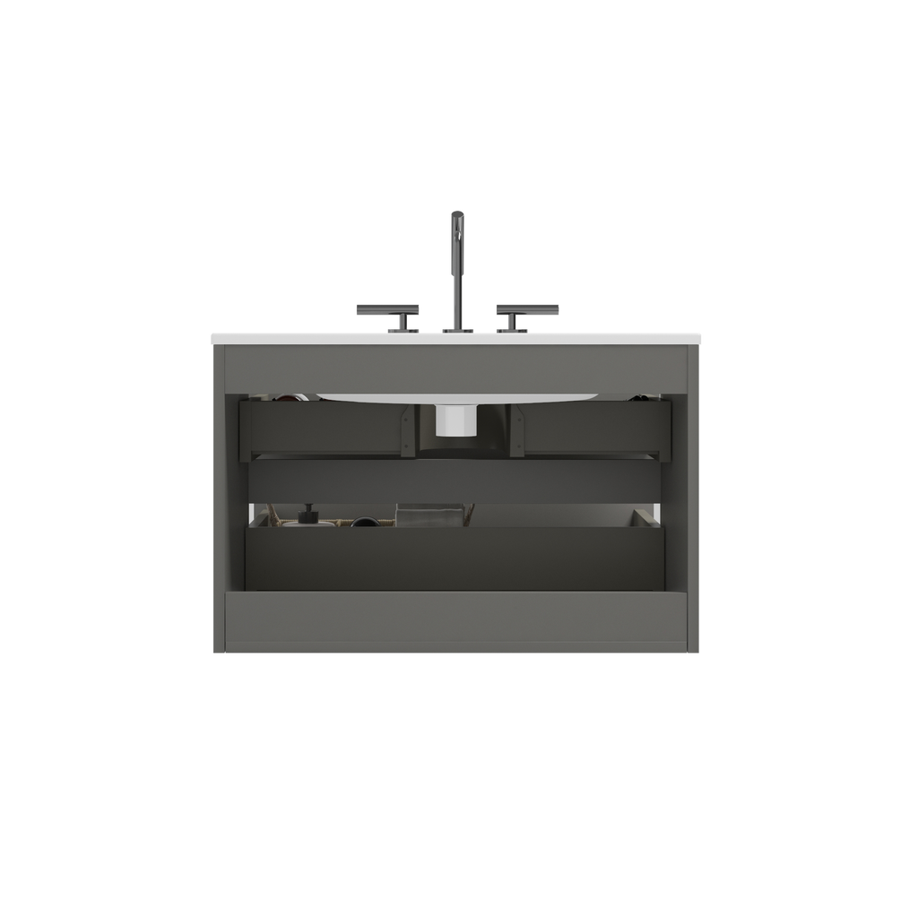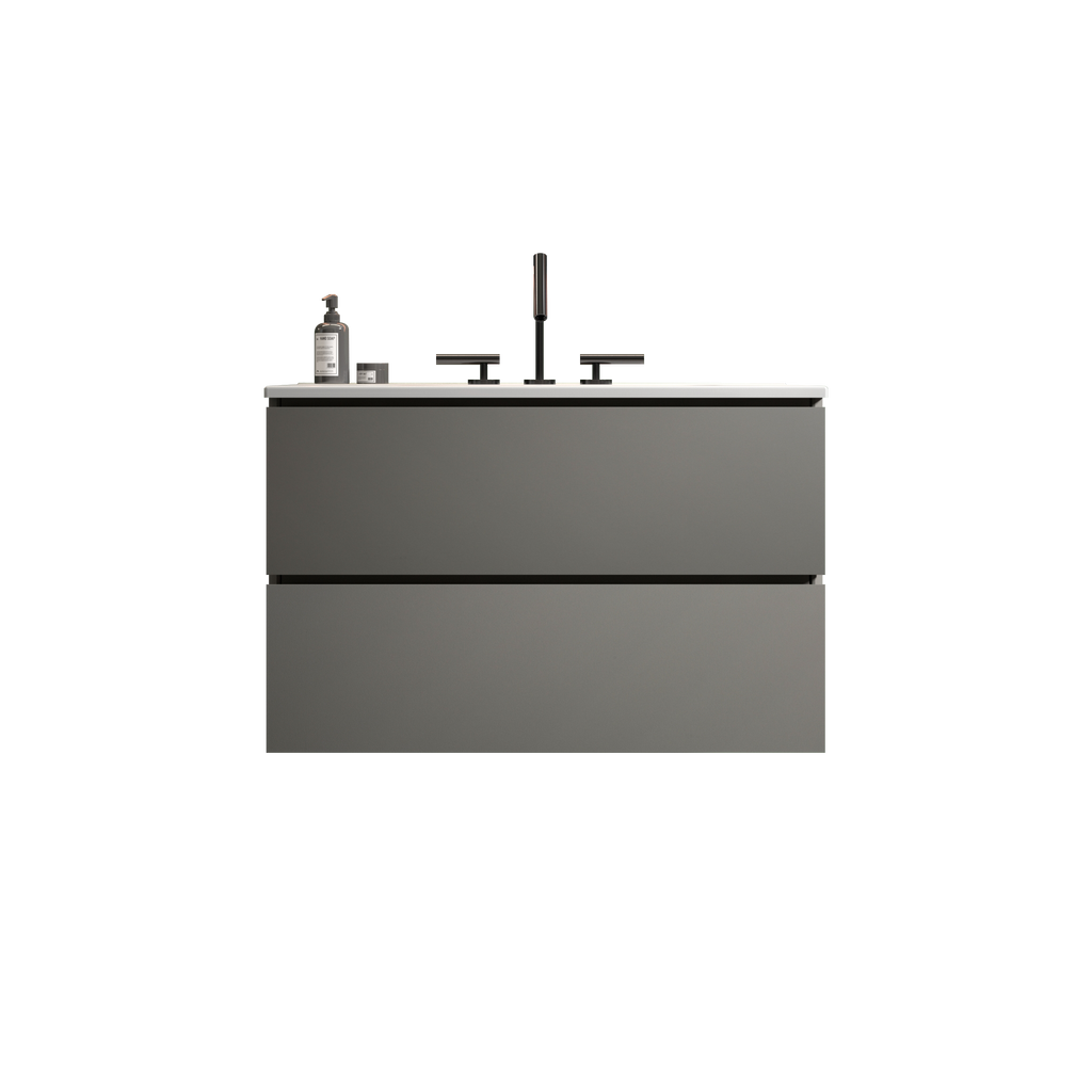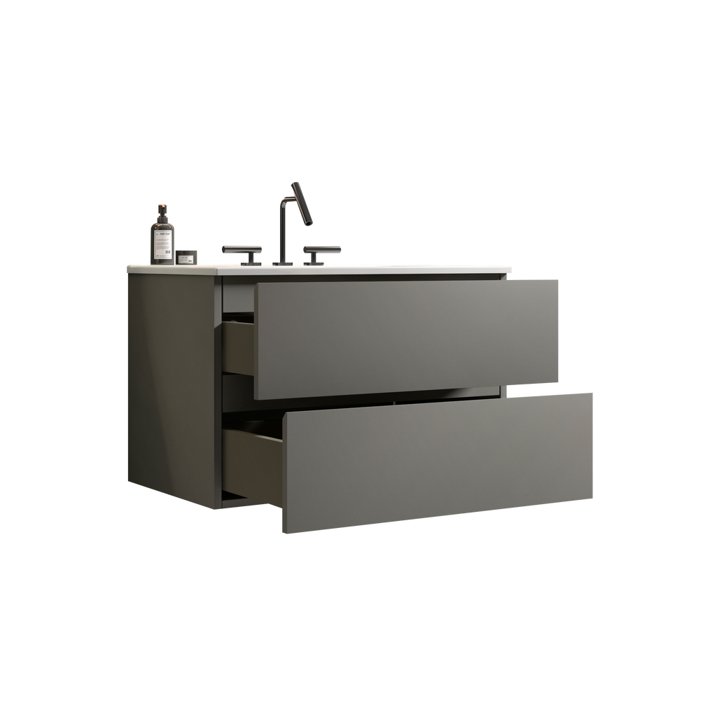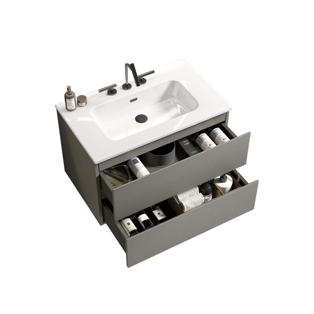The double drawers maximize the use of space, offering a 20% increase in storage capacity to keep your bathroom essentials organized and within reach. And thanks to the DTC soft-closing silent drawer runners, you can enjoy a serene environment, free from disruptive noises. Featuring an integrated 45° sloping handle-free design, it embraces a minimalist approach to design. The space grey cabinet enhances the visual appeal and creates a seamless look, adding a touch of modern refinement to your bathroom.