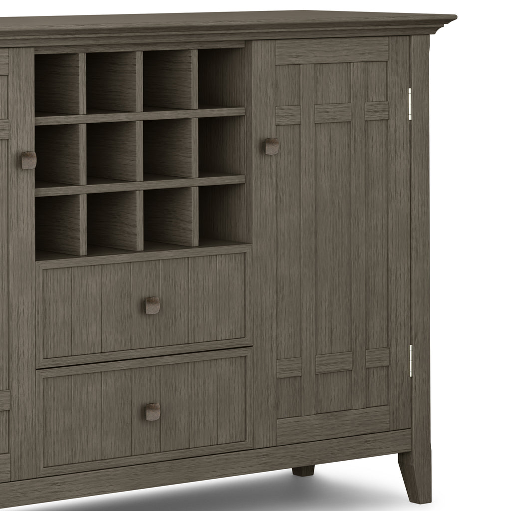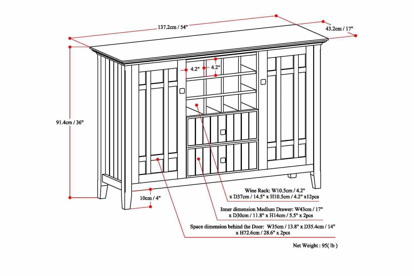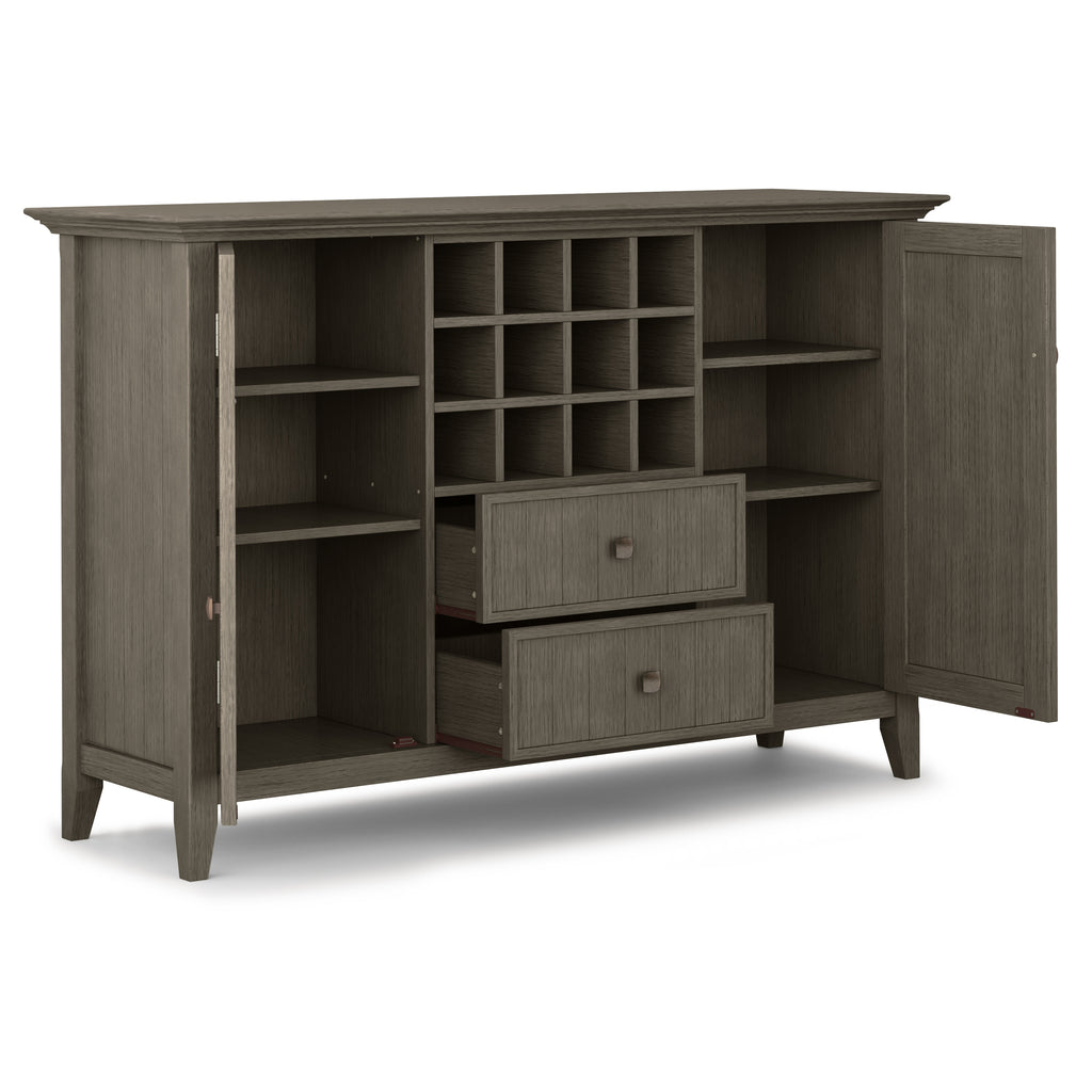 - Features two (2) central drawers with metal glides, two (2) side doors that open to large storage spaces with two (2) shelves each and a twelve (12) bottle wine storage rack.