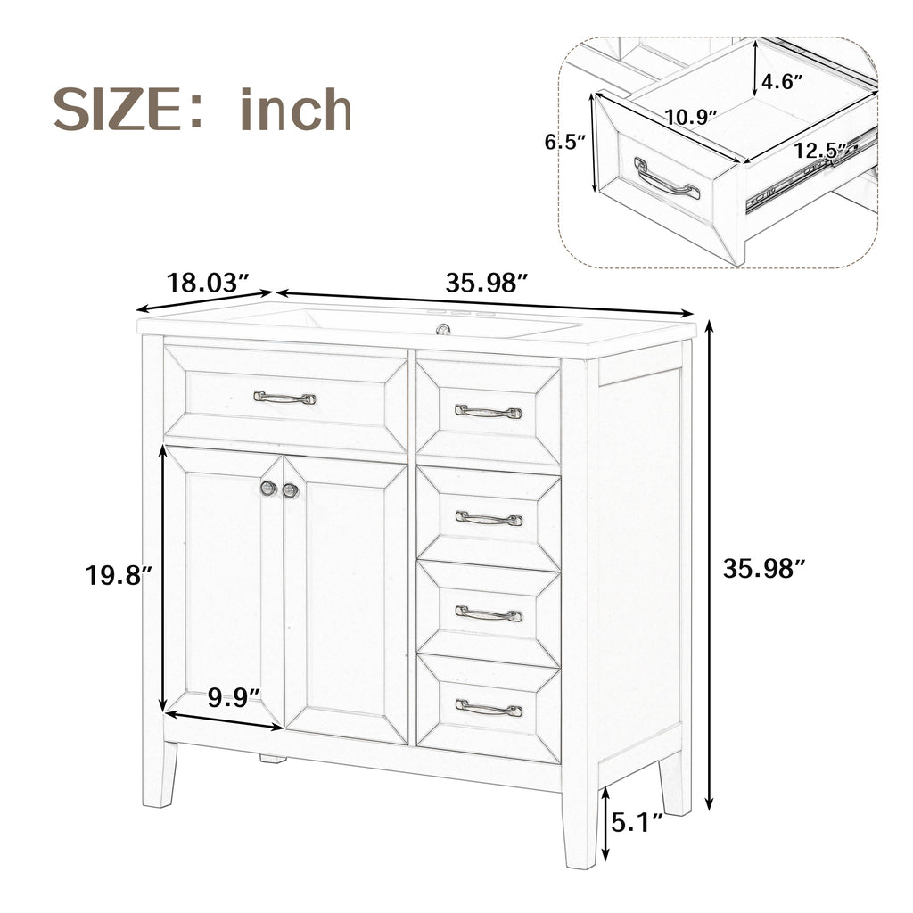 - Vanity with Cabinet and Drawers: Considering the humid environment in bathroom, this bathroom vanity has ample enclosed storage spaces: One cabinet with two doors and three drawers with slide rail (the top two drawers are for decoration use only). You can put soaps, towels, shampoos, tissue paper and other bathroom essentials in it so to keep them away from dust.