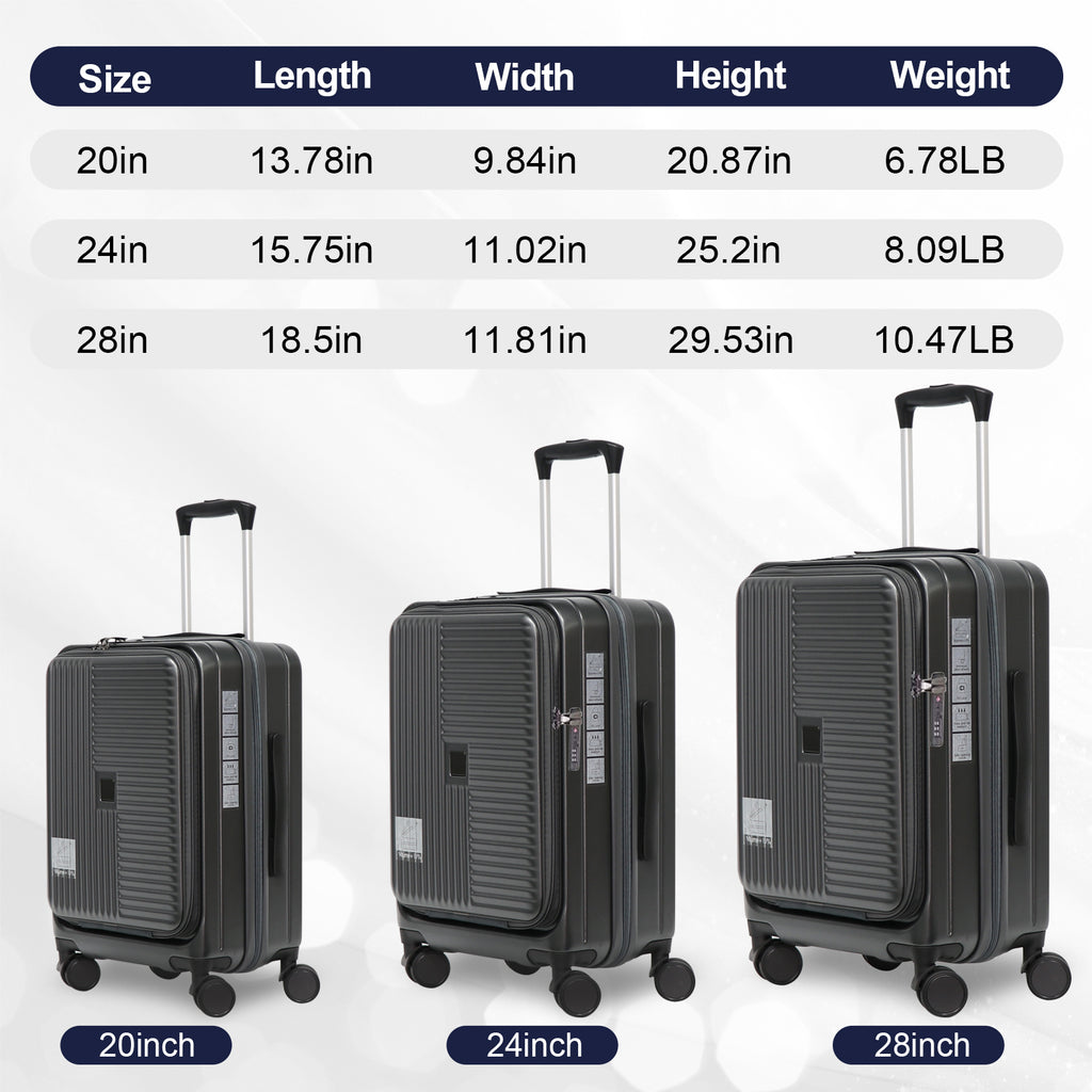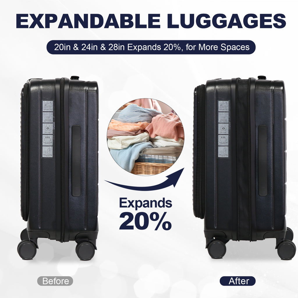 - Versatile Sizes: The 20' carry-on includes a front lid with a laptop compartment and mesh pockets for easy access. The 24' and 28' suitcases offer larger capacities with front-opening lids. All sizes expand by 20% for extra storage.