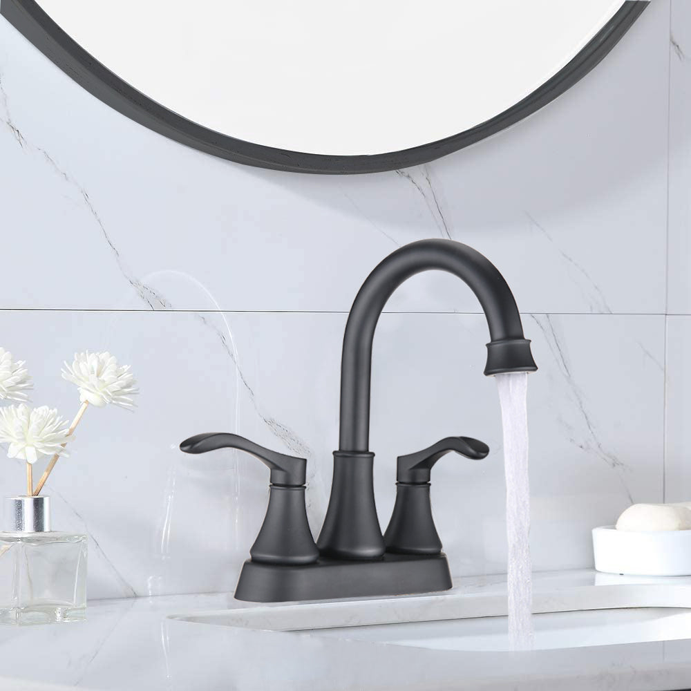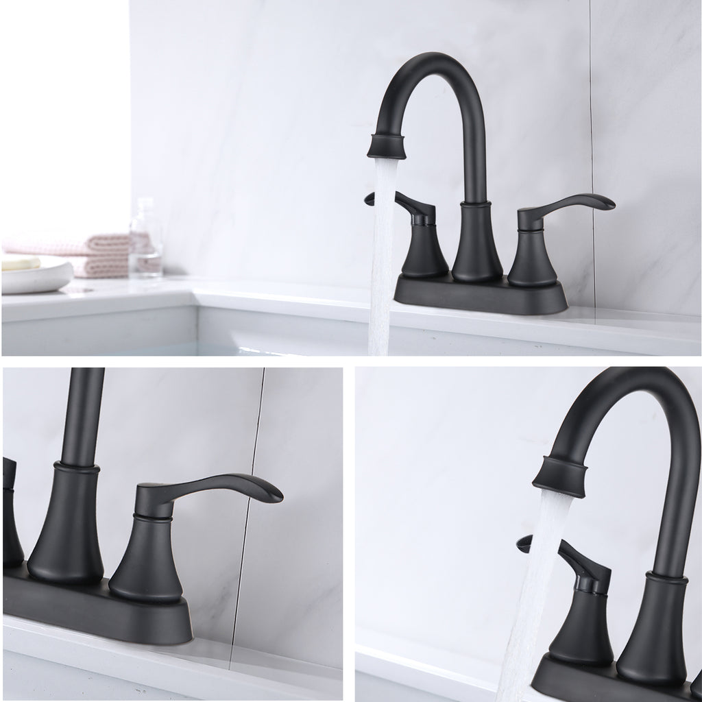 - Two Handle Centerset Lavatory Faucet with Drain Assembly. the faucet features a drain assembly and a 3 hole mount with 4 inch centerset design for easy installation.