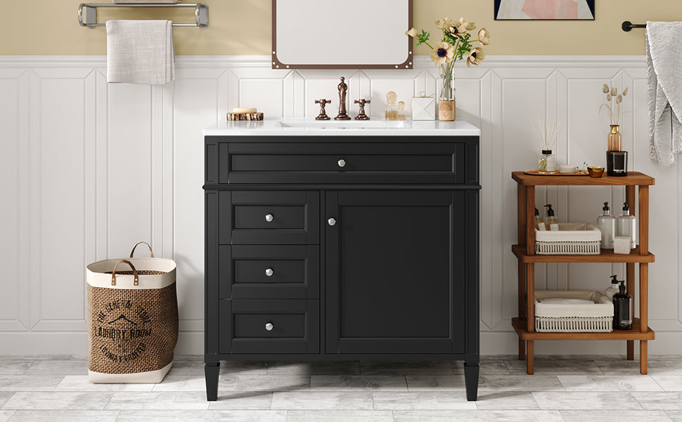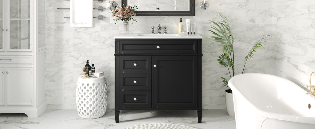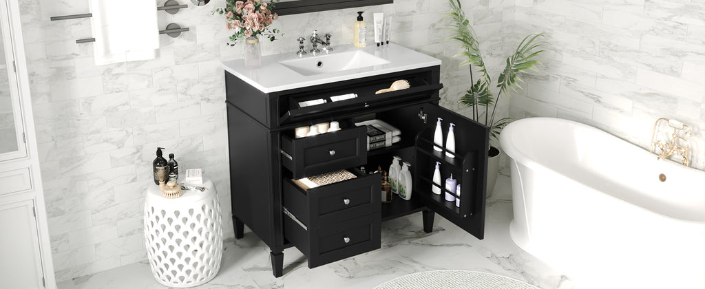- [ Multi-Purpose Cabinet & Concealed Storage ] Are you looking for stylish and functional storage solutions for your bathroom? Our bathroom vanity provide ample space for all your toiletries and bathroom essentials. The combination of the cabinet body and the drawer perfectly stores all kinds of bathroom products and keeps the necessities away from water stains and dust. Soft-close doors and drawer fronts feature a water-resistant paint finish for durability.