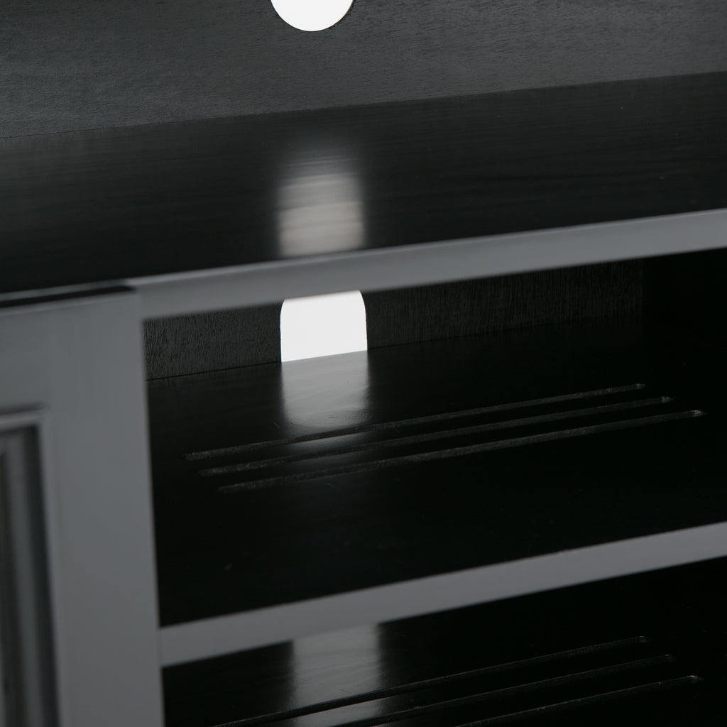 - Features round Antique Pewter knobs, two (2) side doors open to storage areas with two adjustable shelves and a central are with two (2) adjustable shelves and a top open shelf for your media devices
