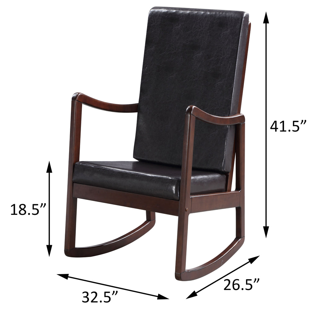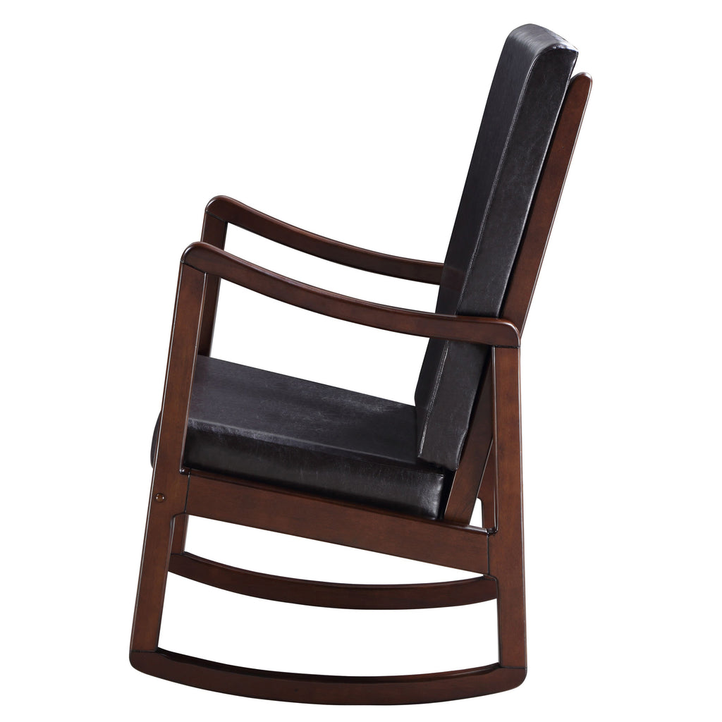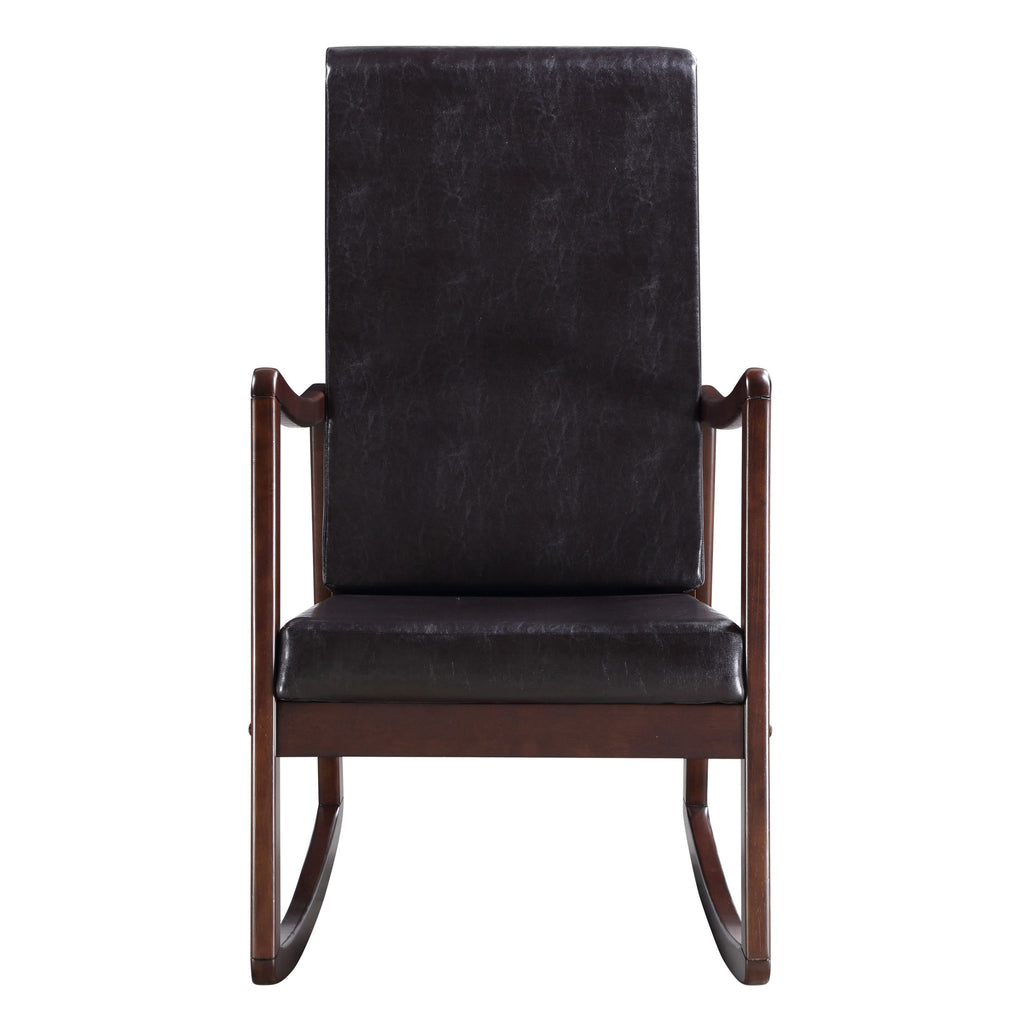 Designed with a contemporary flair, this rocking chair seamlessly integrates into modern interiors, imparting a stylish accent to any space. Its dark brown faux leather upholstery not only exudes luxury but also ensures a comfortable seating experience, while removable cushions offer convenience for easy cleaning and customization to suit your comfort preferences.