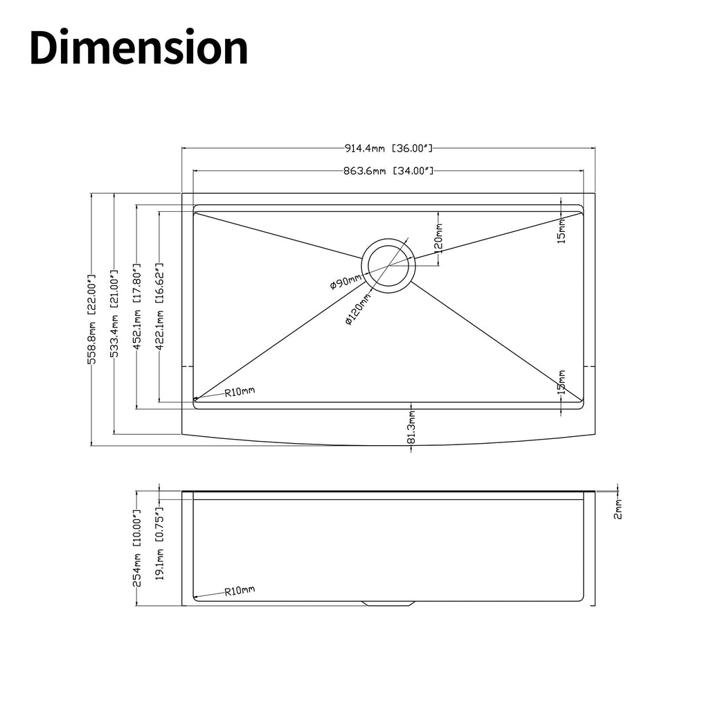 - Farmhouse Apron Single Bowl Stainless Steel Kitchen Sink with an integrated ledge to support sliding accessories. This sink creates a multifunctional workspace to streamline all your kitchen tasks. The workstation kit allows you to work over the sink without losing counter space. The sink uses dent-resistant T304 stainless steel for superior strength and durability.Dimension: Overall size: 36'x22'x10', Interior bowl: 34'x16.62', Detph: 9'