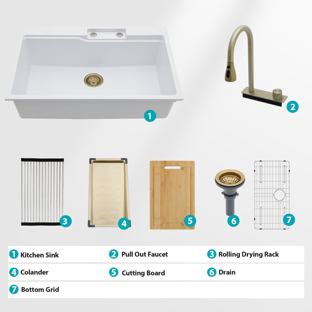 - [Package included] 1 x Sink,1 x Drying Roll-up Rack,1 x Baskets Strainers Assembly,1 x Bottom Grid,1 x cutting board,1 x installation clips, ,1 x colander,1 x pull-out faucet,1 x cutout template and installation Guide.