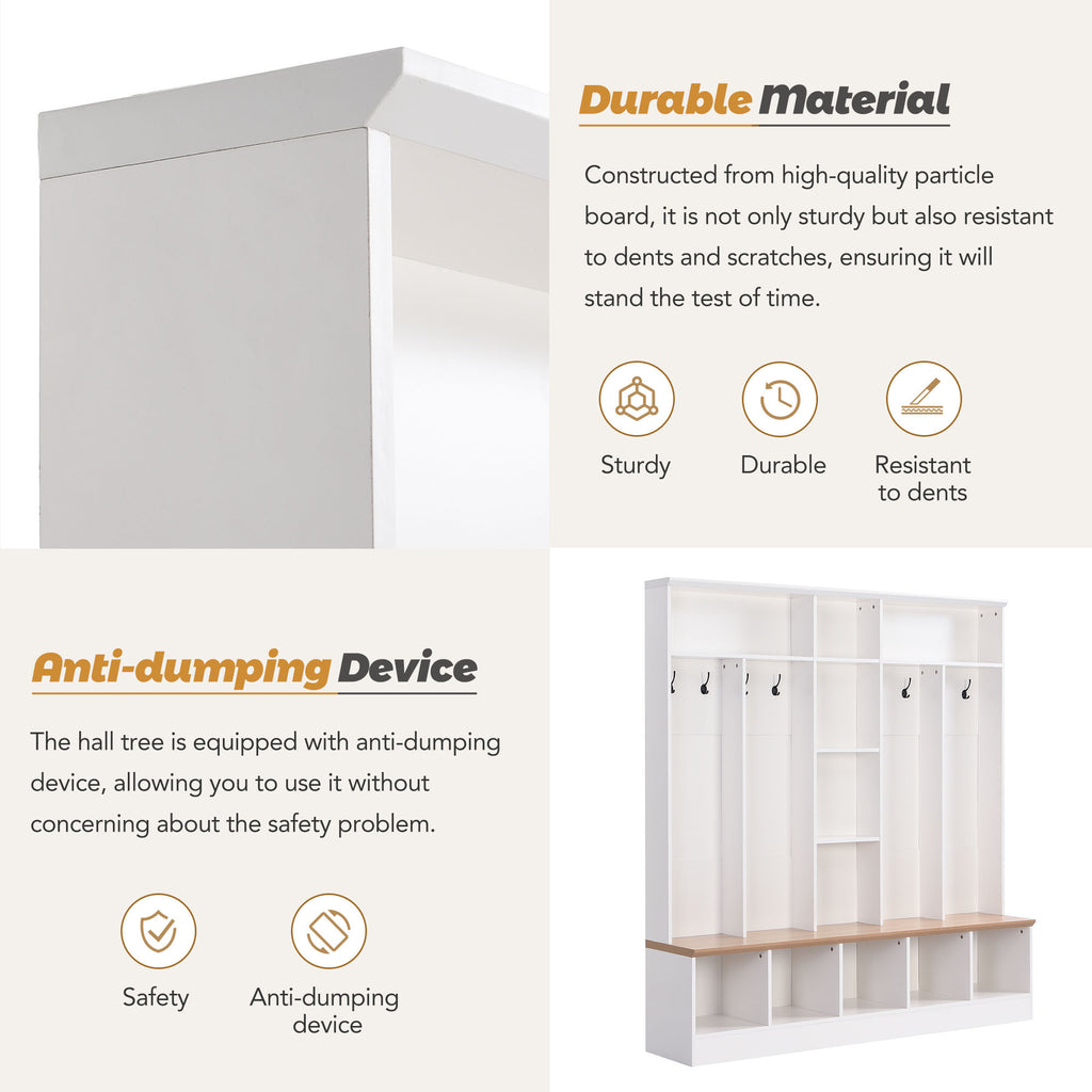 Constructed from high-quality particle board, it is not only sturdy but also resistant to dents and scratches, ensuring it will stand the test of time. The hall tree is equipped with anti-dumping device, allowing you to use it without concerning about the safety problem.