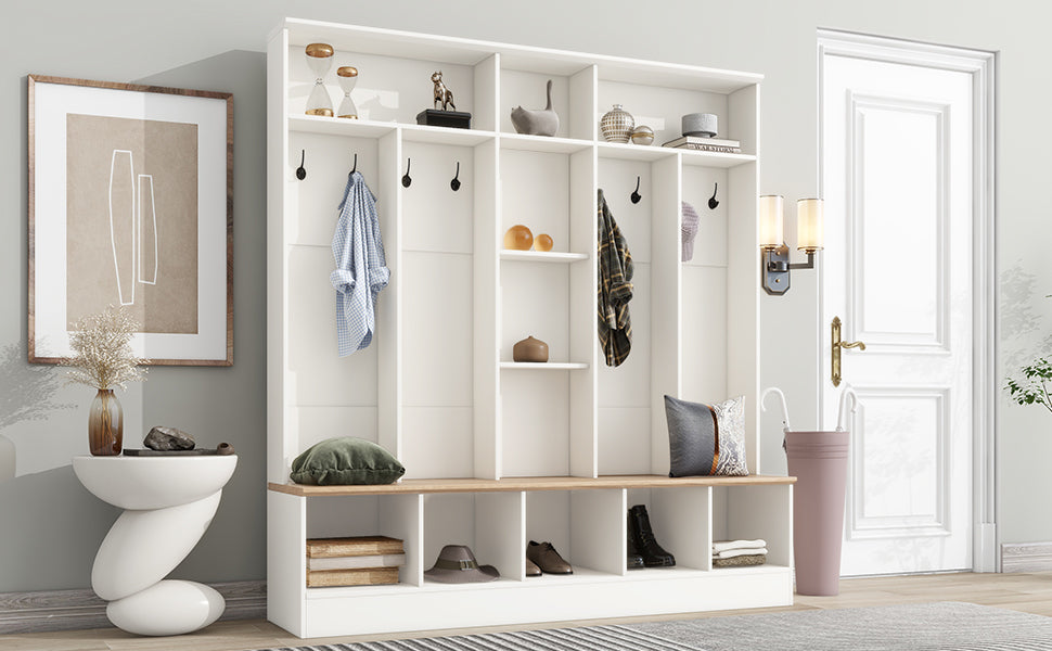 Hall tree boasts an impressive storage capacity, with five large cube storage spaces under the seat and various open shelves to accommodate items of all sizes. The eight hooks above are perfect for your coats, hats and bags, keeping the hallway clutter-free.