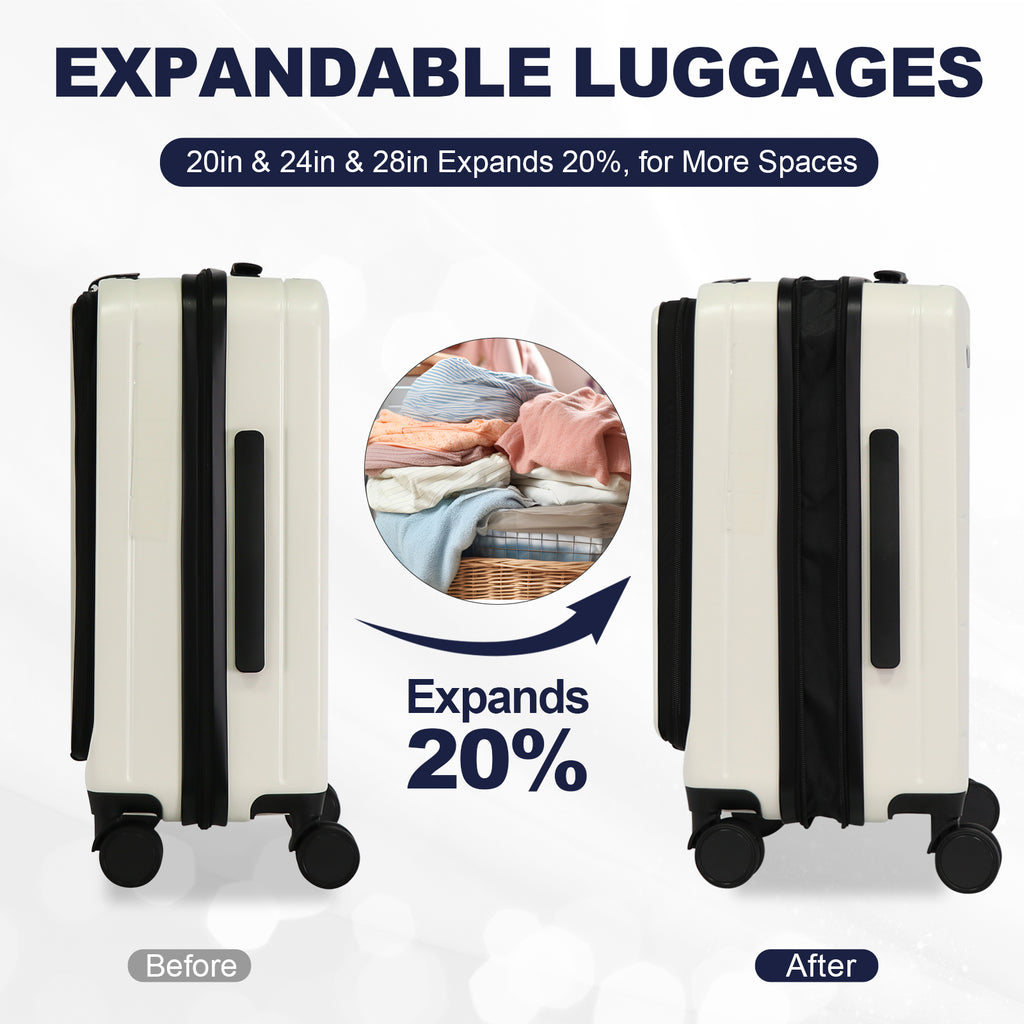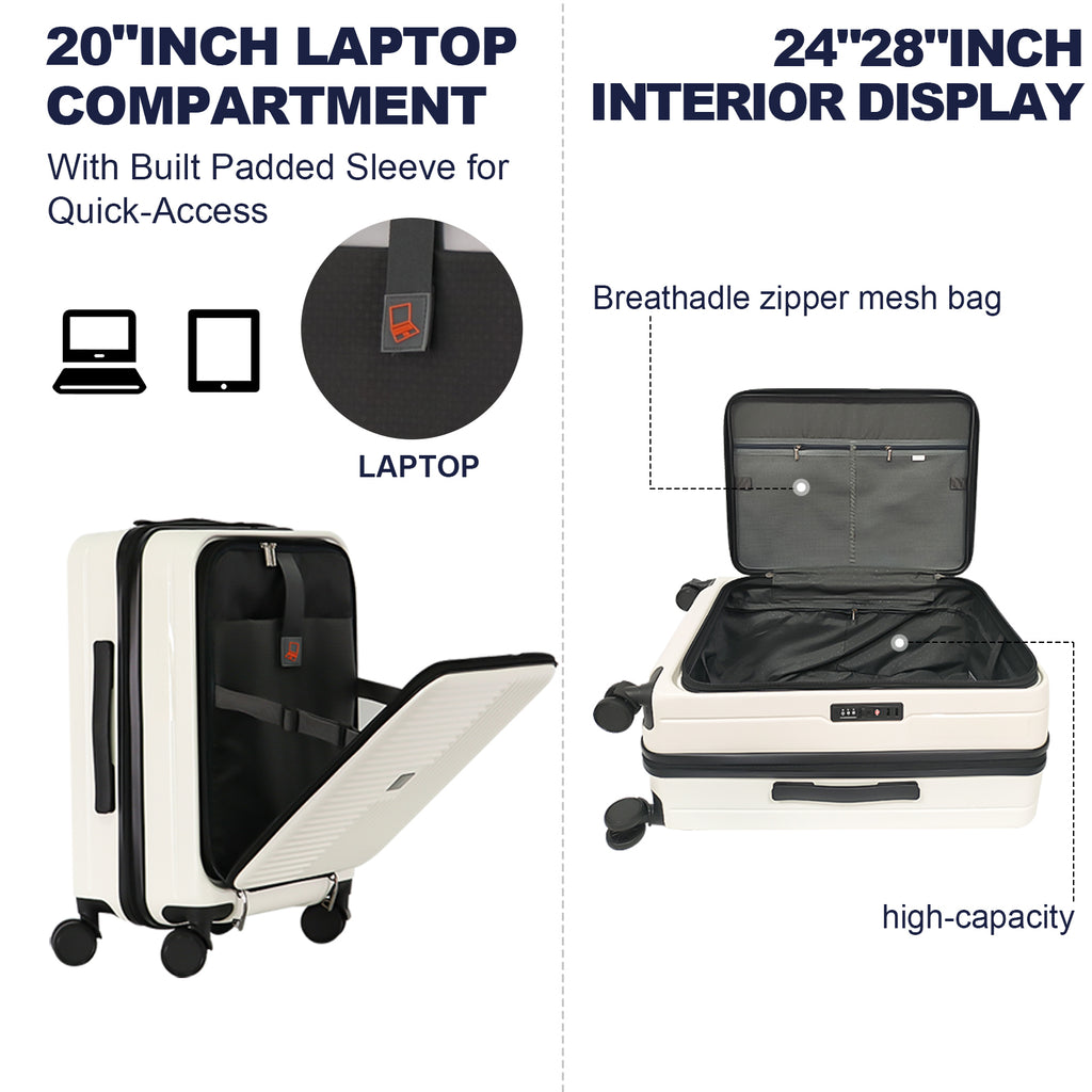 - Versatile Sizes: The 20' carry-on includes a front lid with a laptop compartment and mesh pockets for easy access. The 24' and 28' suitcases offer larger capacities with front-opening lids. All sizes expand by 20% for extra storage.