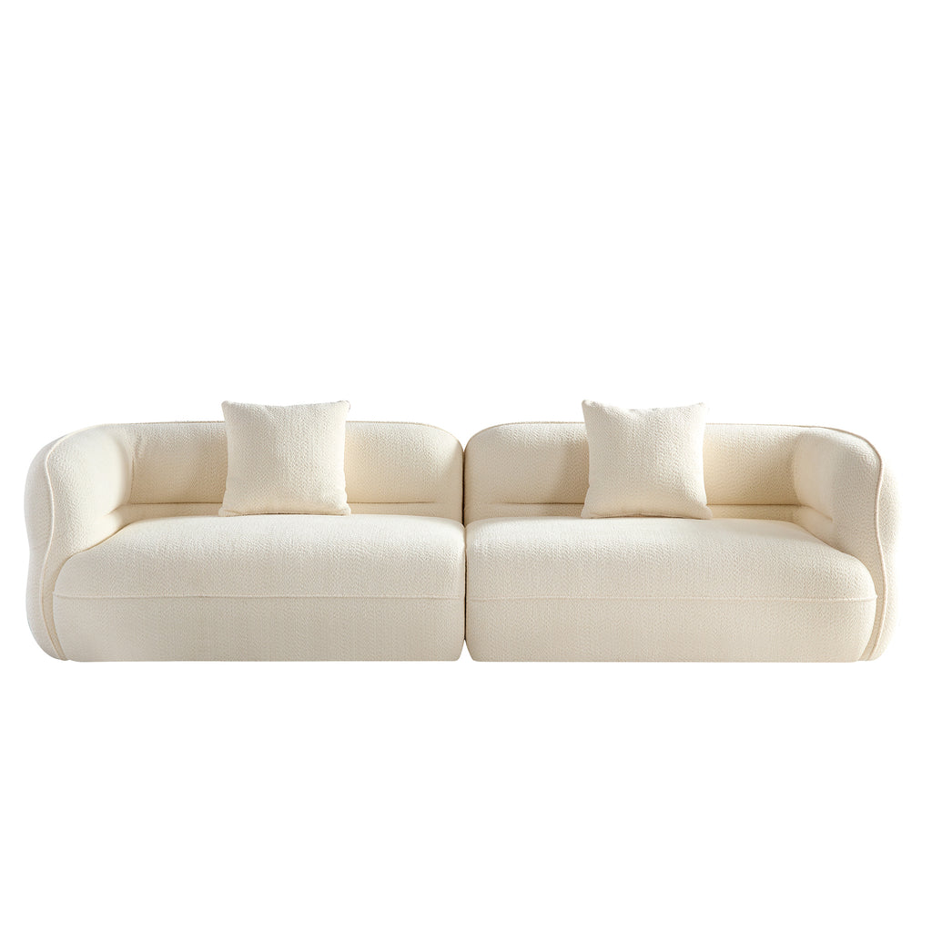 White, two-part modular sofa, durable fabric, solid wood frame, high density and high rebound sponge fill, creative inspiration from toast, 2 throw pillows.