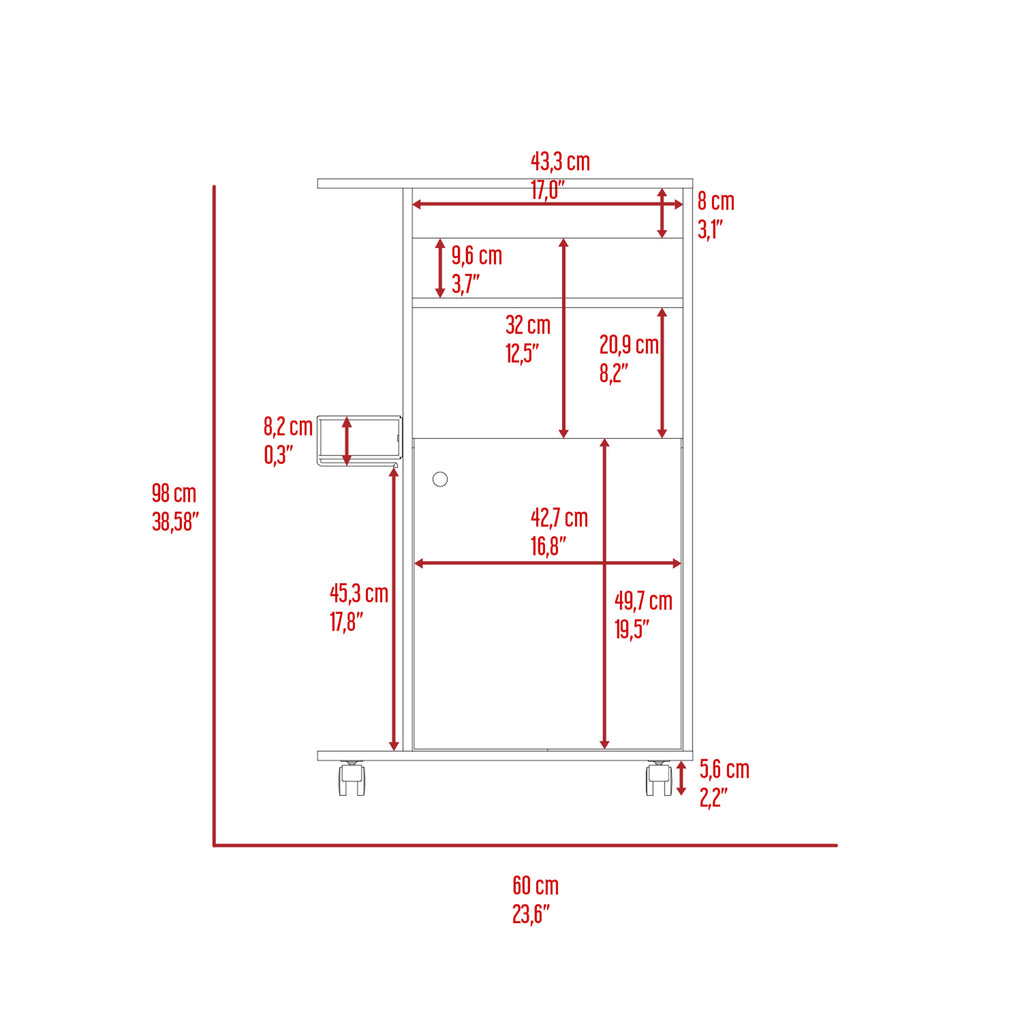This versatile unit features four caster wheels for smooth movement and easy relocation, while its single shelf offers a convenient and organized space for storing or displaying essentials. The clean white finish enhances the sense of space and complements various interior designs, making it an ideal choice for any room, especially for keeping your microwave accessible and freeing up counter space.