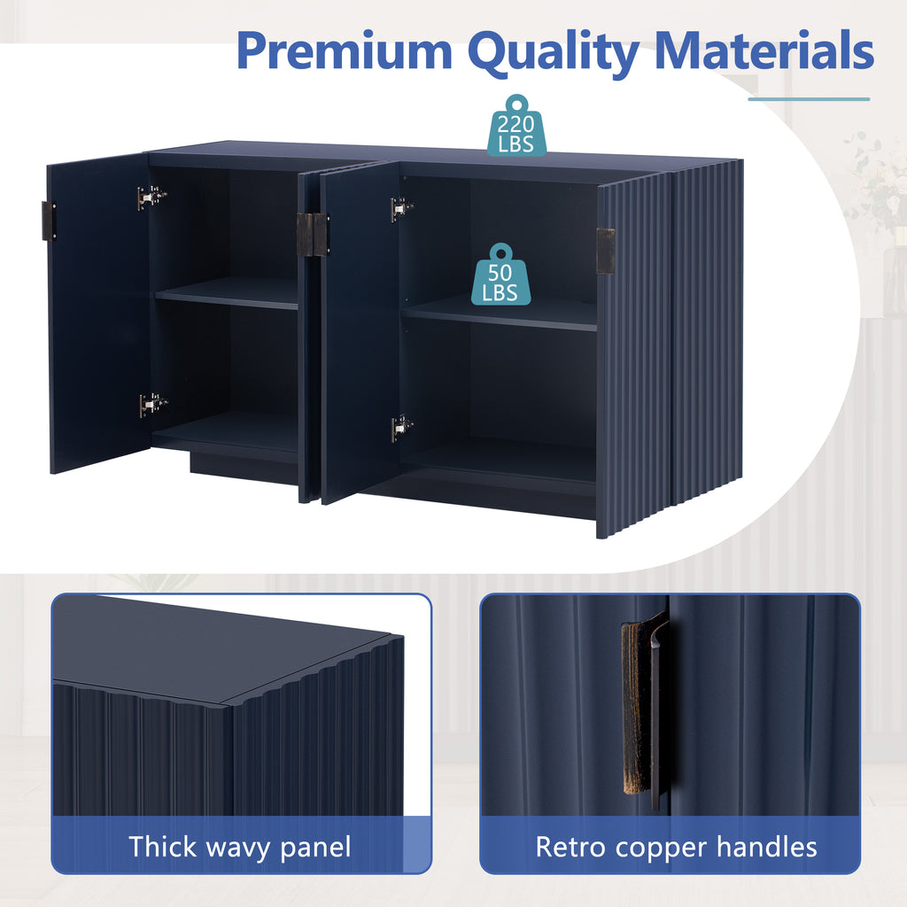 This sideboard features 4 beautiful fluted doors that adds a touch of elegance to your area. The unique wave design not only serves as a visual centerpiece but also seamlessly integrates with various interior styles. Constructed entirely from MDF, this buffet cabinet boasts a sturdy and durable build that can withstand daily use, the top has a load capacity of 220 LBS, and each inner shelf has a load capacity of 50 LBS.