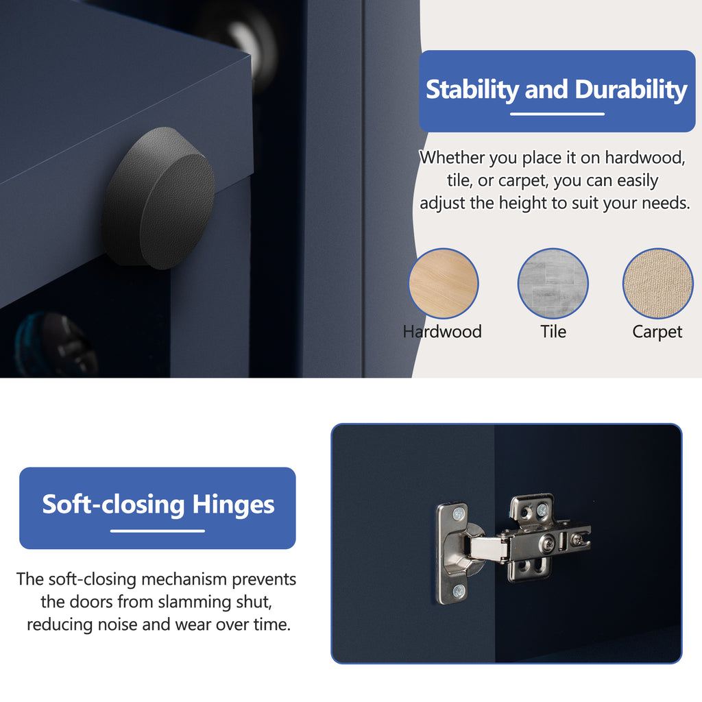 - Stability and Durability:This buffet cabinet comes with adjustable height plastic foot pads, ensuring that it remains stable on uneven floors. These foot pads not only provide extra stability but also protect your floors from scratches and damage. Whether you place it on hardwood, tile, or carpet, you can easily adjust the height to suit your needs. Featuring soft-closing hinges, this furniture ensures quiet and smooth door operation, reducing noise and wear over time.