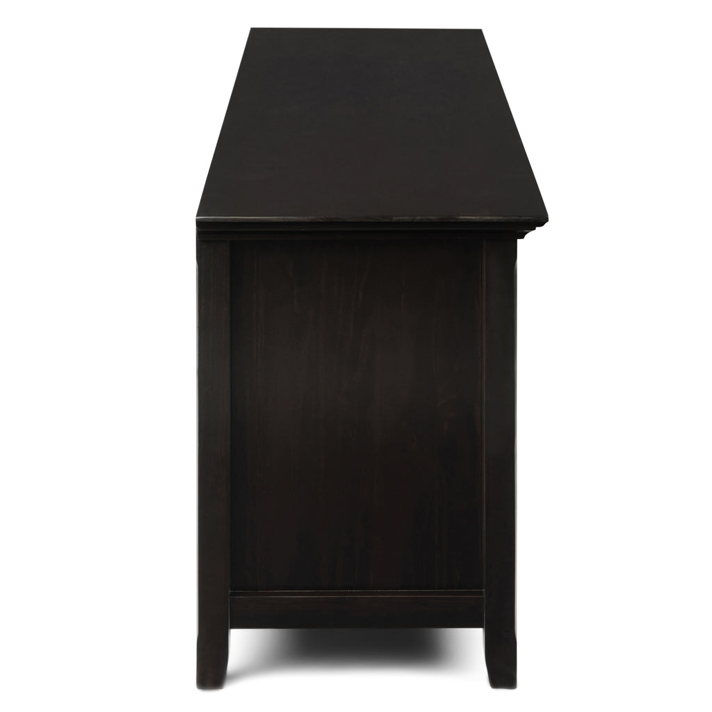 - Features a large centrally located open area with two drawers as well as two (2) framed doors with enclosed spaces; the two (2) large side storage cabinets open to one adjustable shelf each.