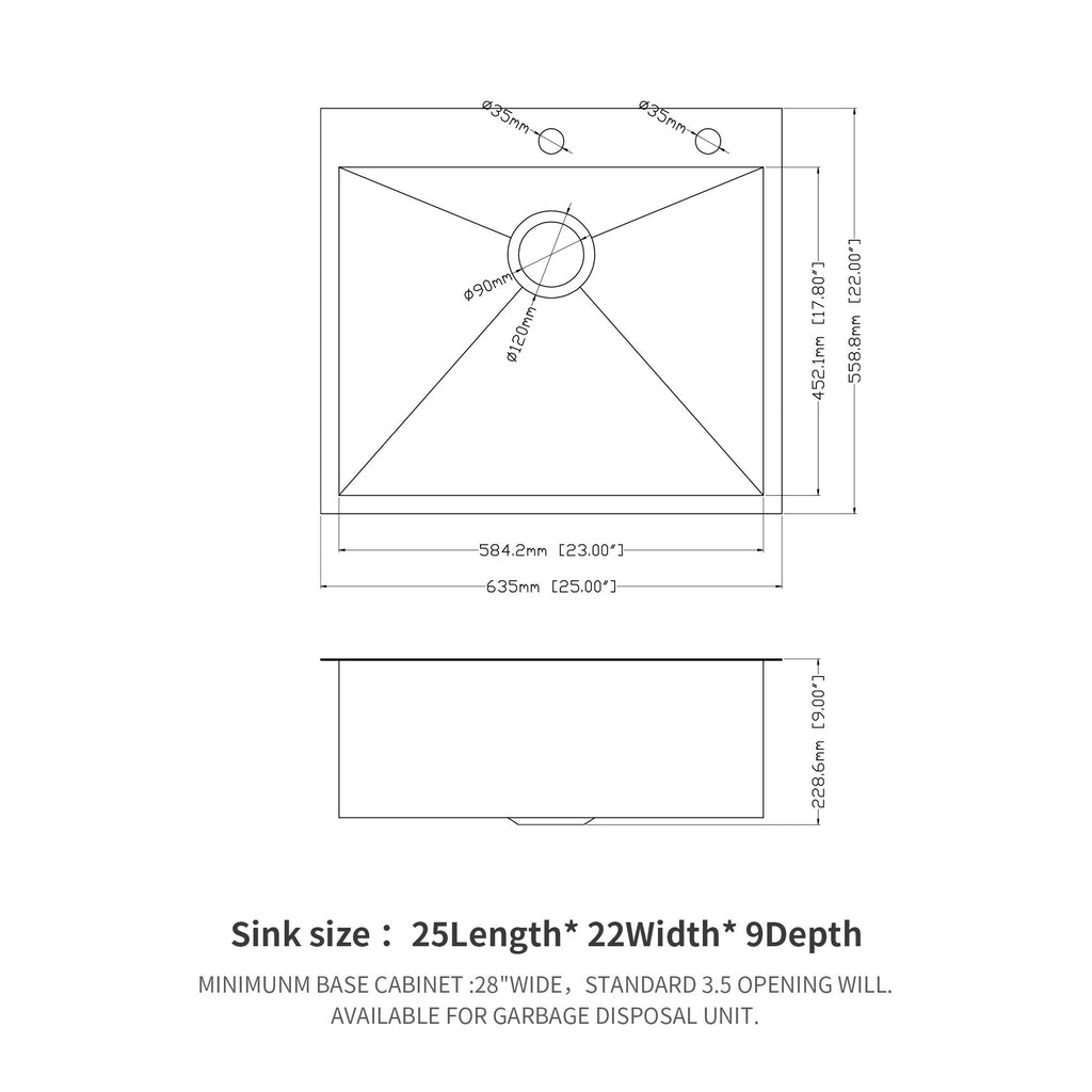 - [Dimensions] Sink Size:25 x 22 x 9 inch , Interior Dimensions: 23'x17.8'. Minimum cabinet size is 28 inch. Standard 3.5' drain openings will fit the most common garbage disposal unit.