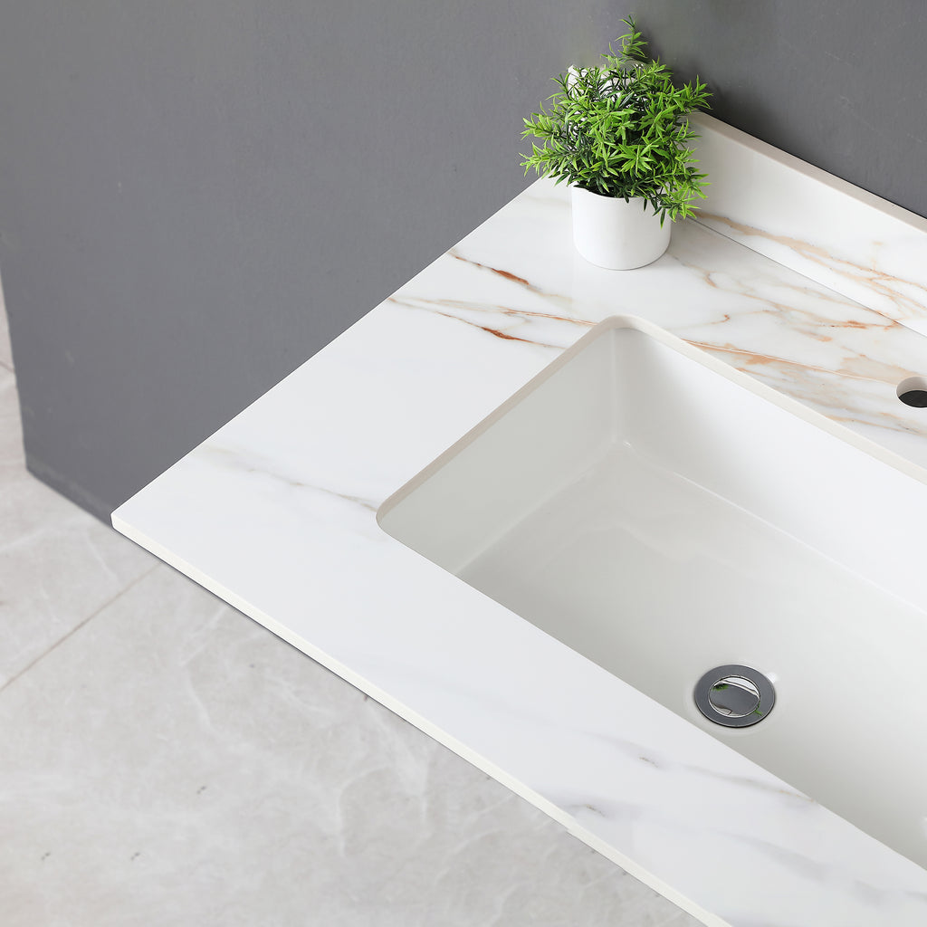 - Package Includes: vanity top with assembled rectangular ceramic sinks, 4' high backsplash. Besides, an extremely solid package - Reinforced packaging making sure a safe delivery. (Attention: Cabinet and faucet NOT INCLUDED).