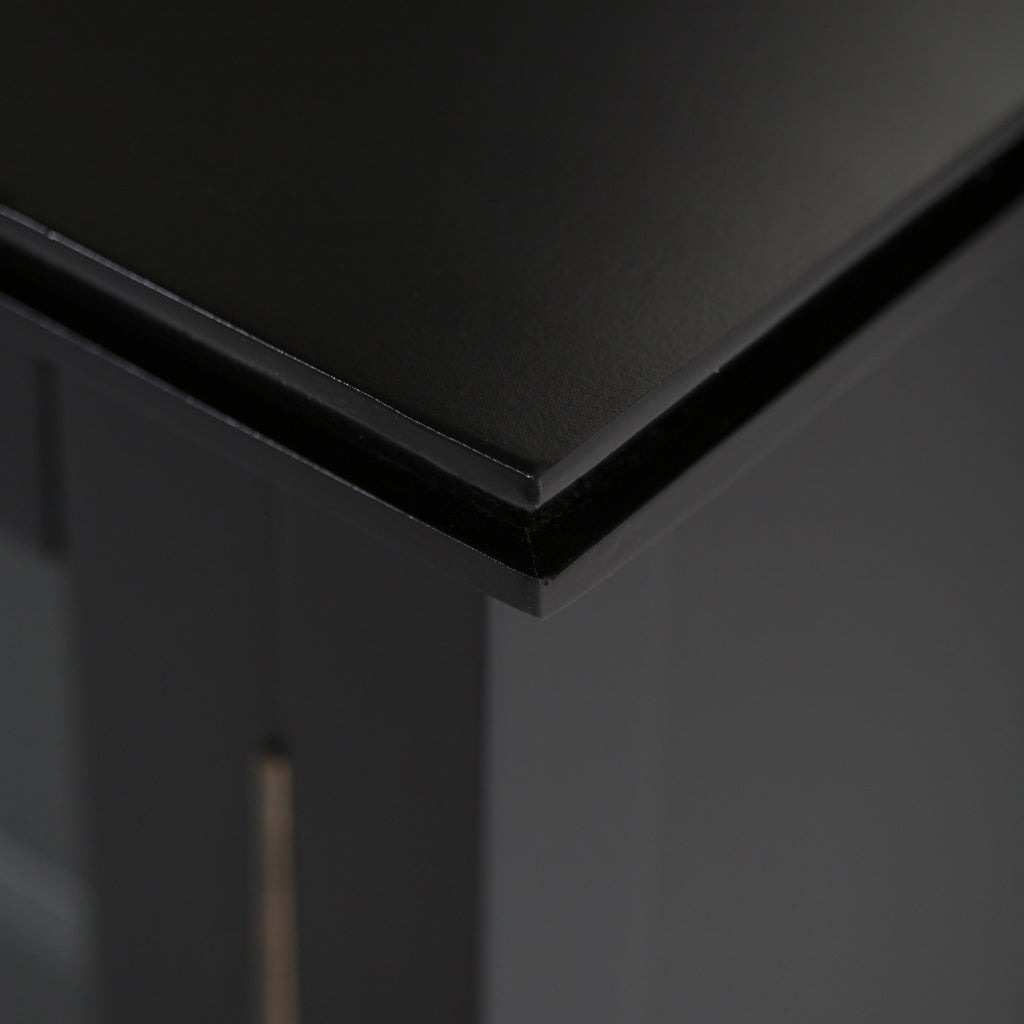 - Transitional design includes clean angle edged table, square, slightly tapered leg and rectangular antique bronze hardware