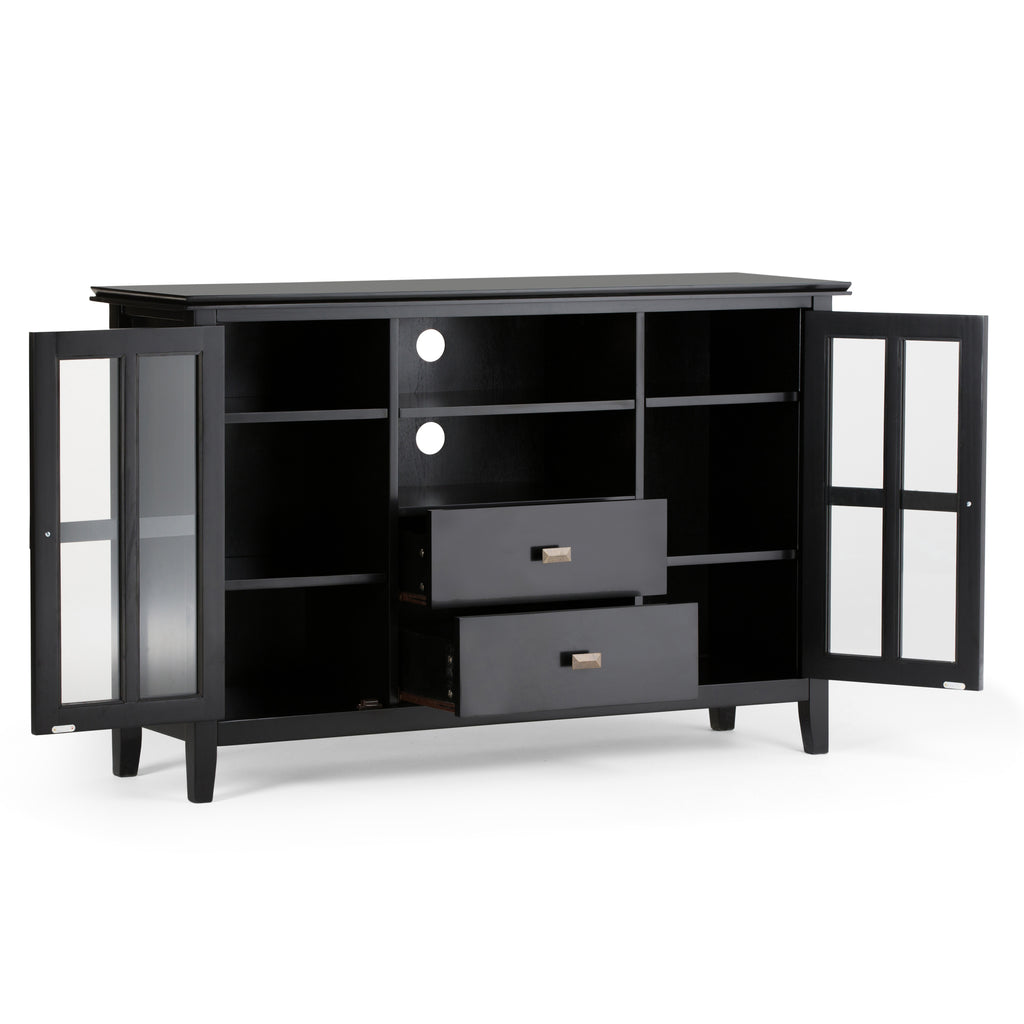 - Features two (2) central drawers with metal glides, open center area with adjustable shelf and two (2) side tempered glass framed doors that open to large storage spaces with two (2) shelves each