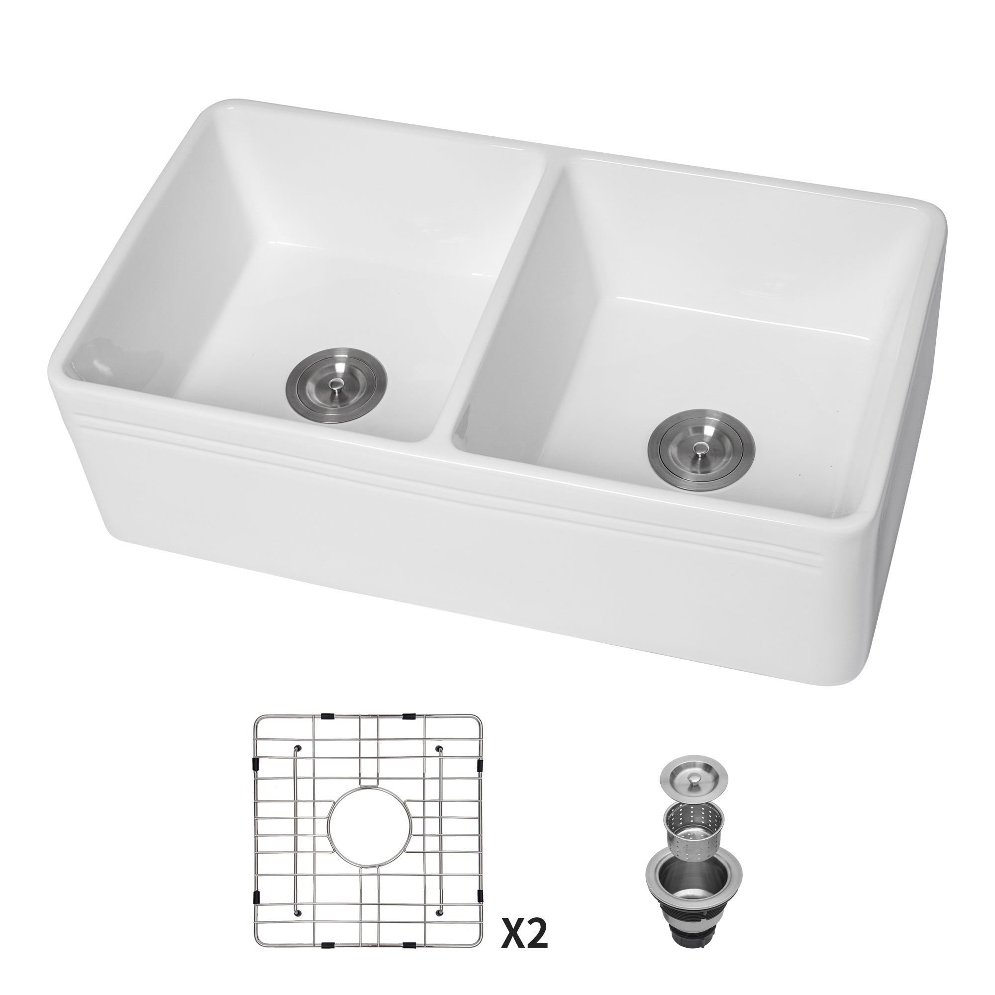 - Highly Durable 33 White Farmhouse Sink Double Bowl: Constructed fromceramic for extreme strength and durability, resistant to heat, chipping, scratch and discoloration for years of beauty and reliable performance. Elegant white color makes it the perfect addition to your kitchen for a lasting impression.