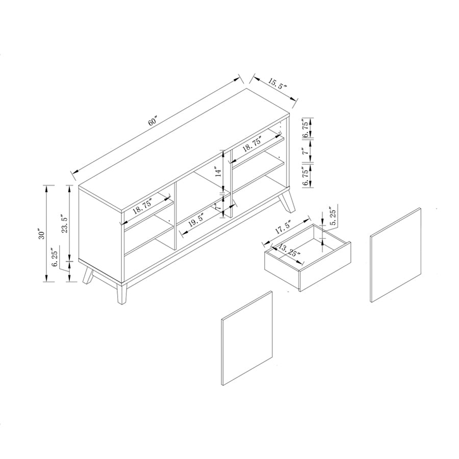 Featuring modern long wooden bar handles, this sideboard and tv stand offers plenty of storage space via two door storage cabinet, one drawer and eight shelves. The drawer comes with pre-assembled metal drawer glides. The doors are connected by metal euro hinges offering longevity use. Two open center shelves allow for easy every day grabbing materials. The enclosed storage cabinet hides away clutter from sight. The wooden flair legs and two tone color finish give it a modern look. Finished in a sturdy melamine laminate with stamped faux wood grain minimizes scratches.