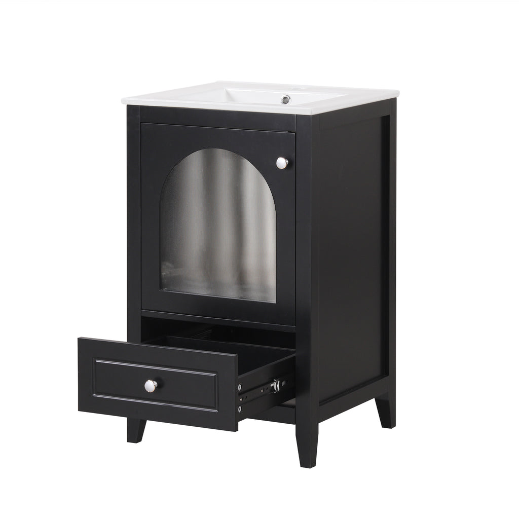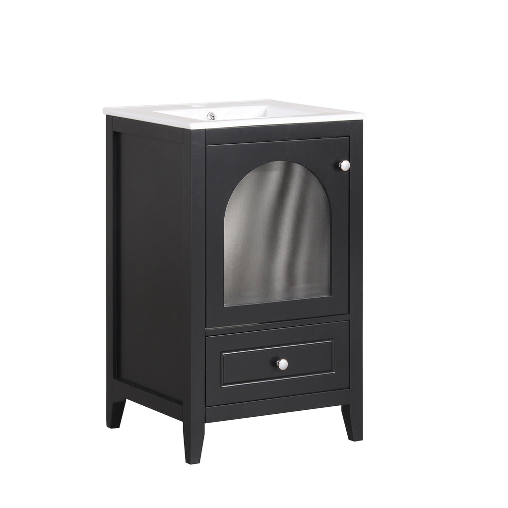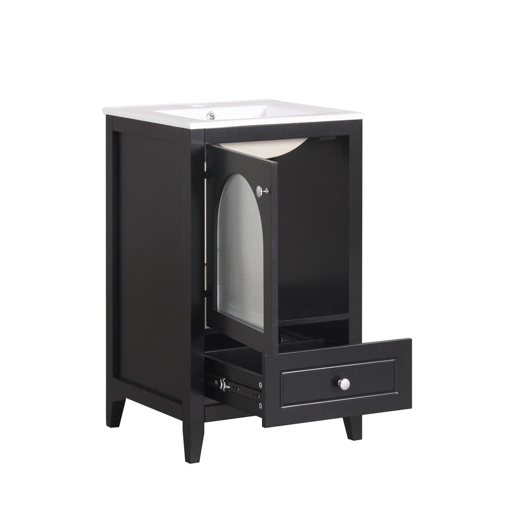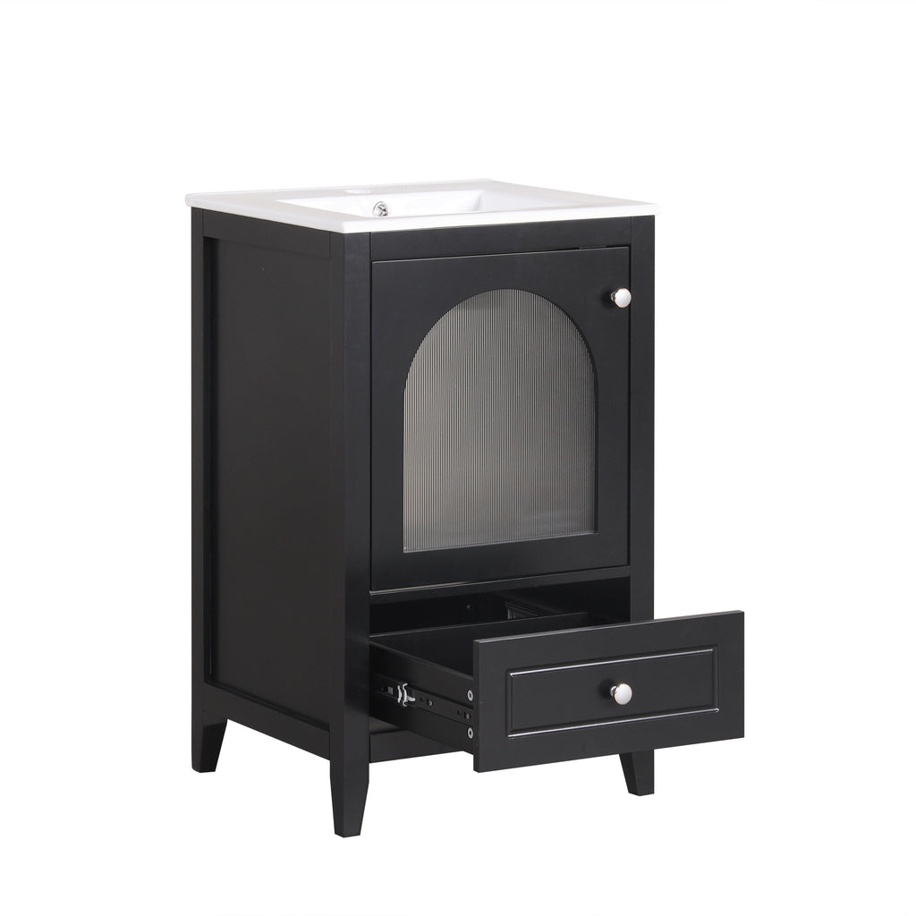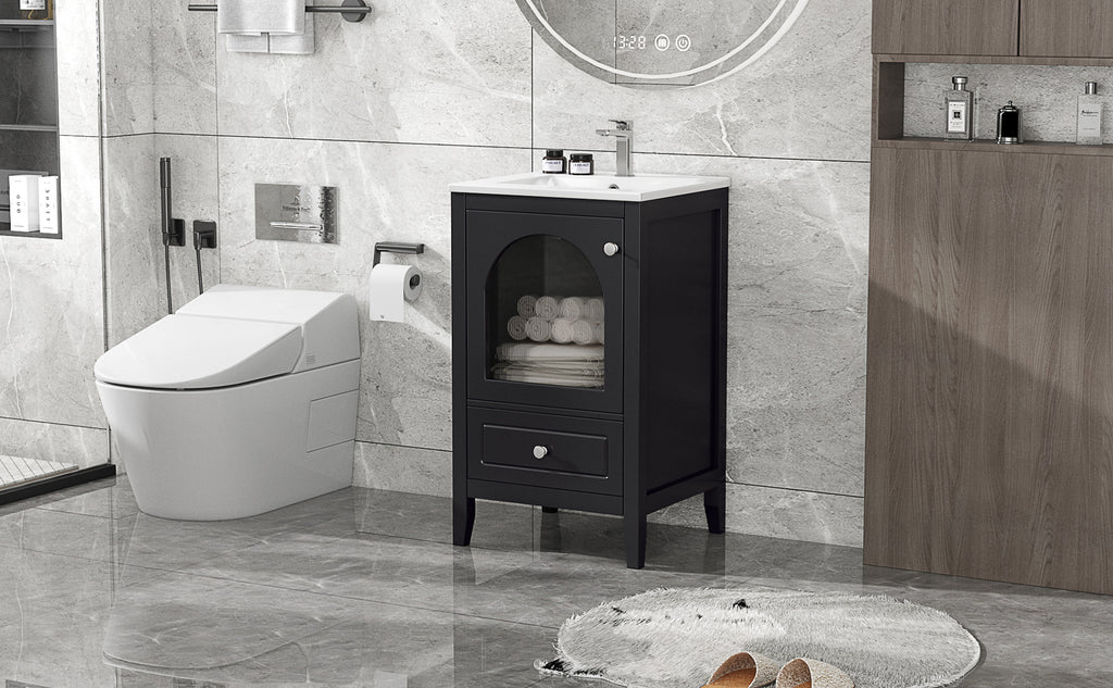 - Vanity with Glass Door Cabinet & Drawer - This bathroom vanity has ample storage space: one cabinet with door, and a big drawer. You can put soaps, towels, shampoos, tissue paper and other bathroom essentials in it so to keep them away from dust.