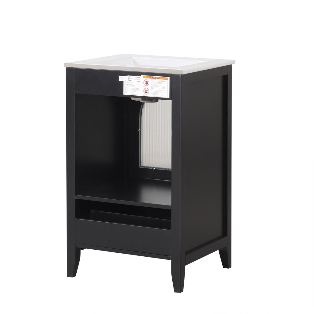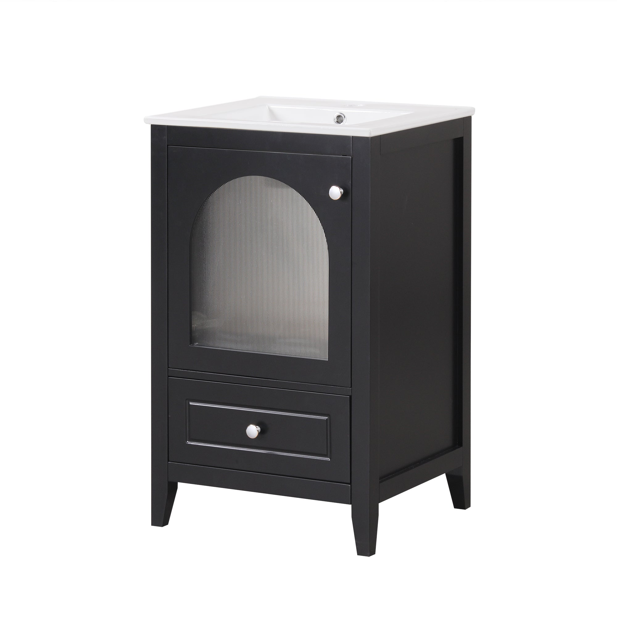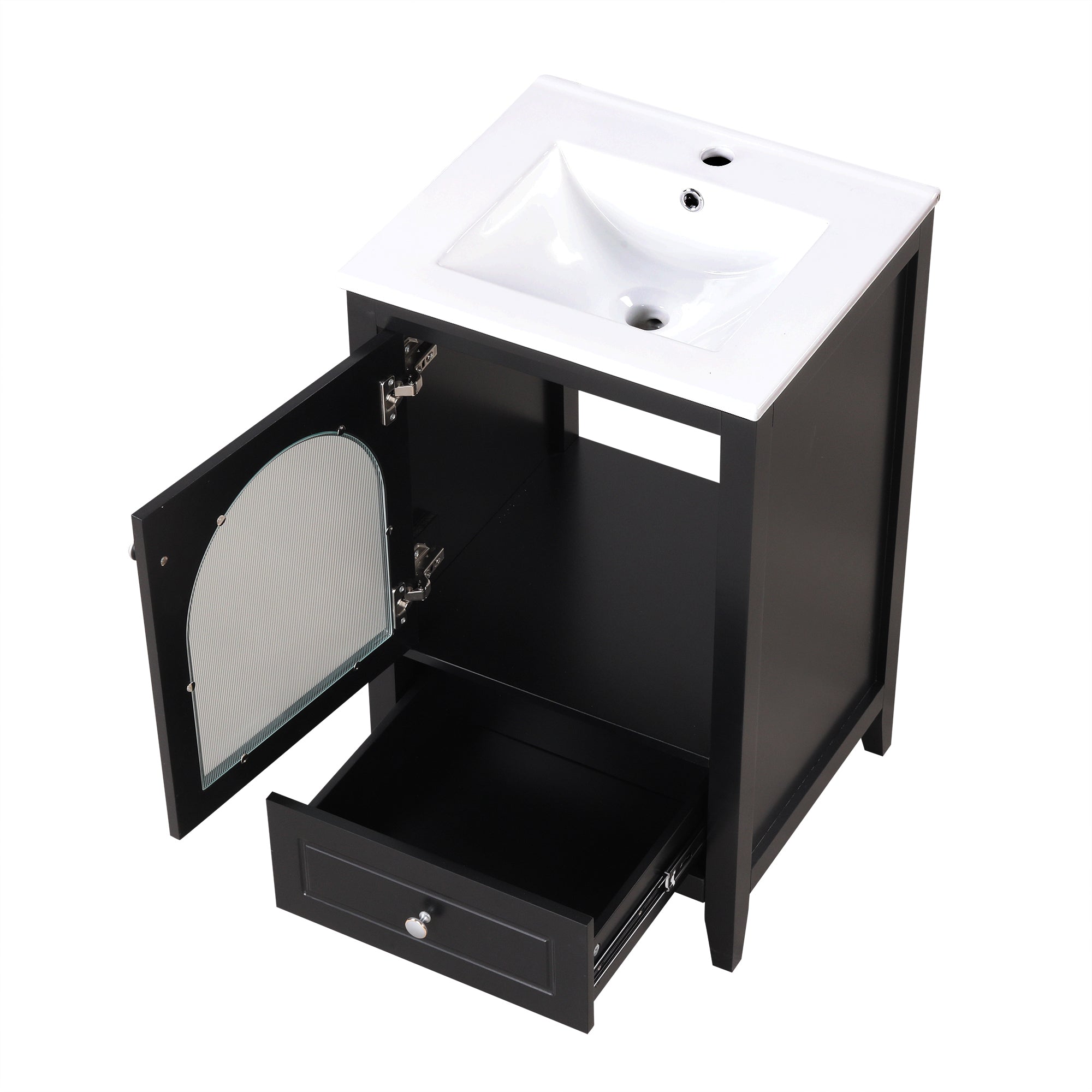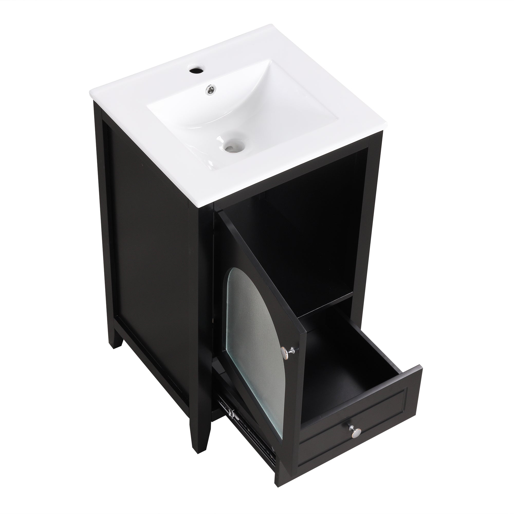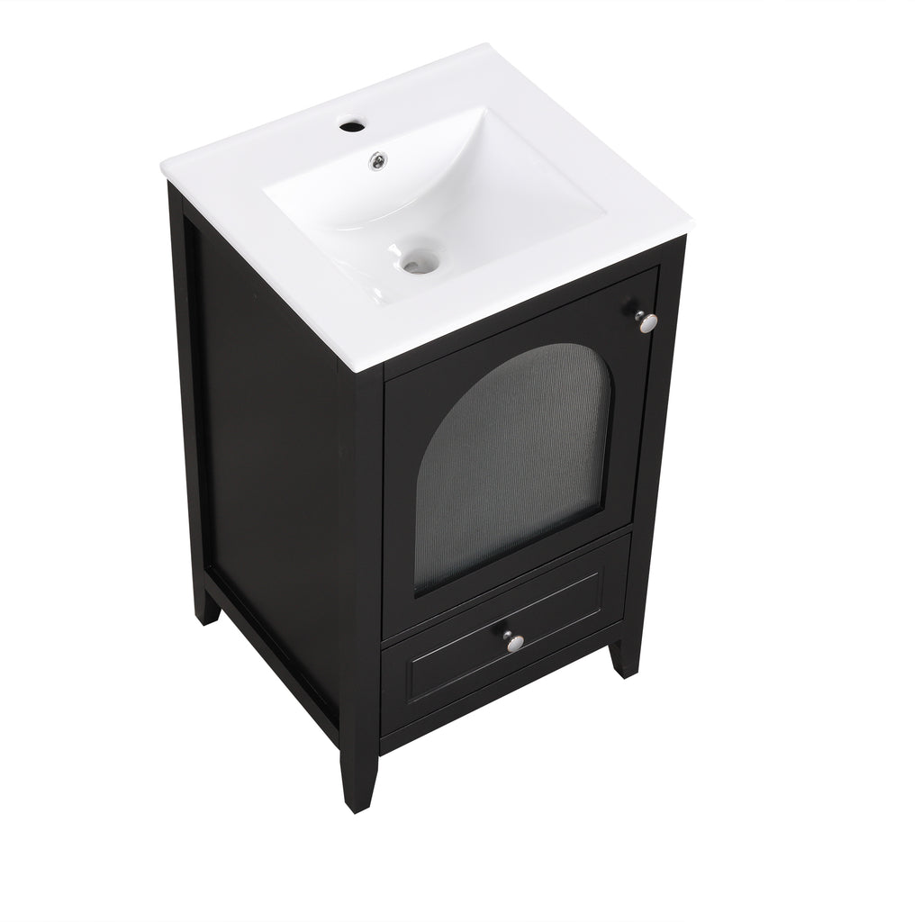 - Vanity with Glass Door Cabinet & Drawer - This bathroom vanity has ample storage space: one cabinet with door, and a big drawer. You can put soaps, towels, shampoos, tissue paper and other bathroom essentials in it so to keep them away from dust.