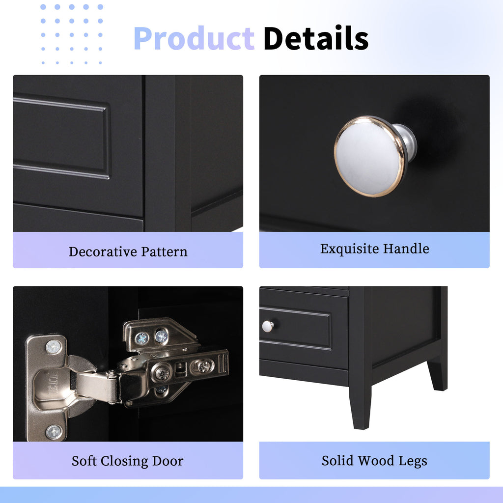 - Thoughtful Details: Considering the humid environment in the bathroom, the door hinges and handle are made of stainless steel, which is not easy to rust. In order to keep silent when open and closing the door, the soft closing door is selected for this cabinet. Silver Metal Knobs on the door, creating a modern look that is smooth to the touch and pleasant to use.
