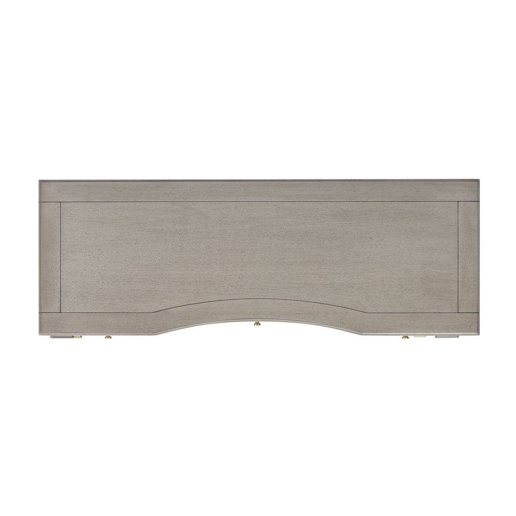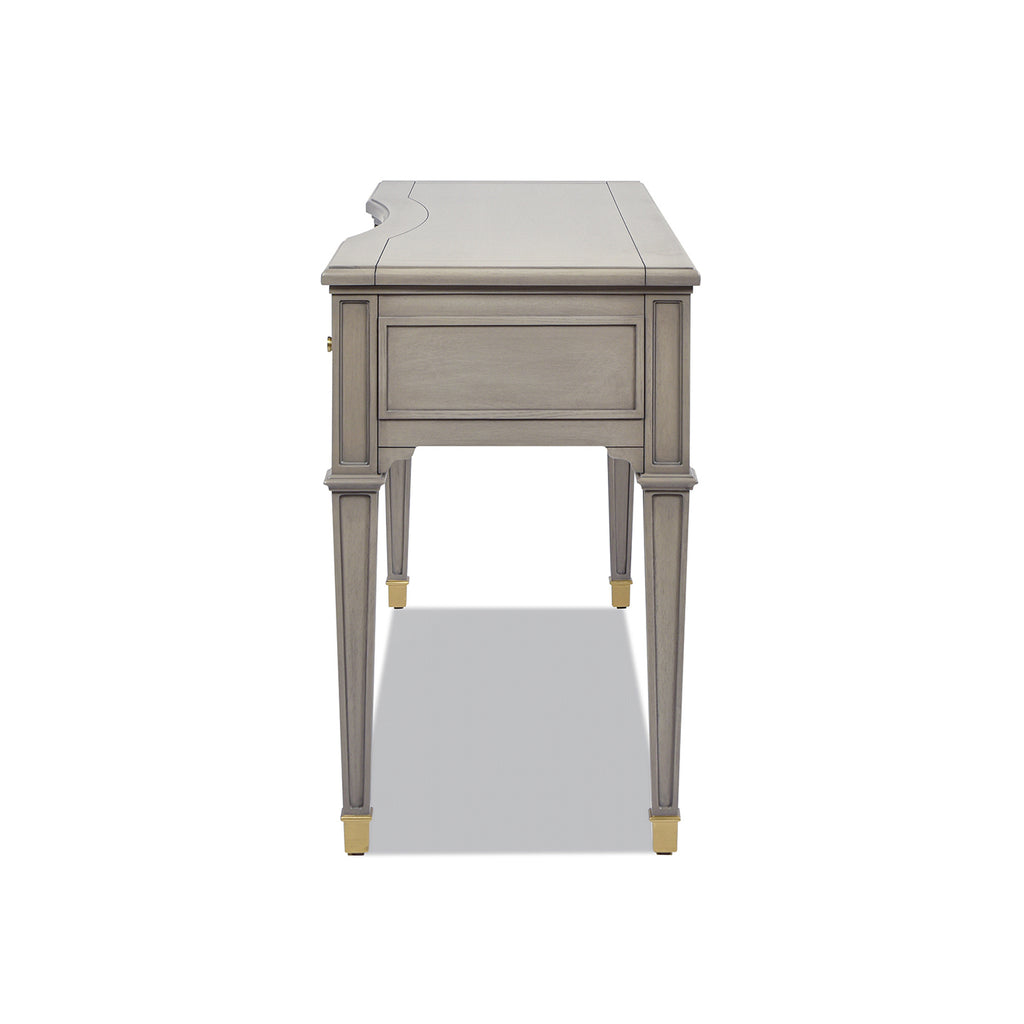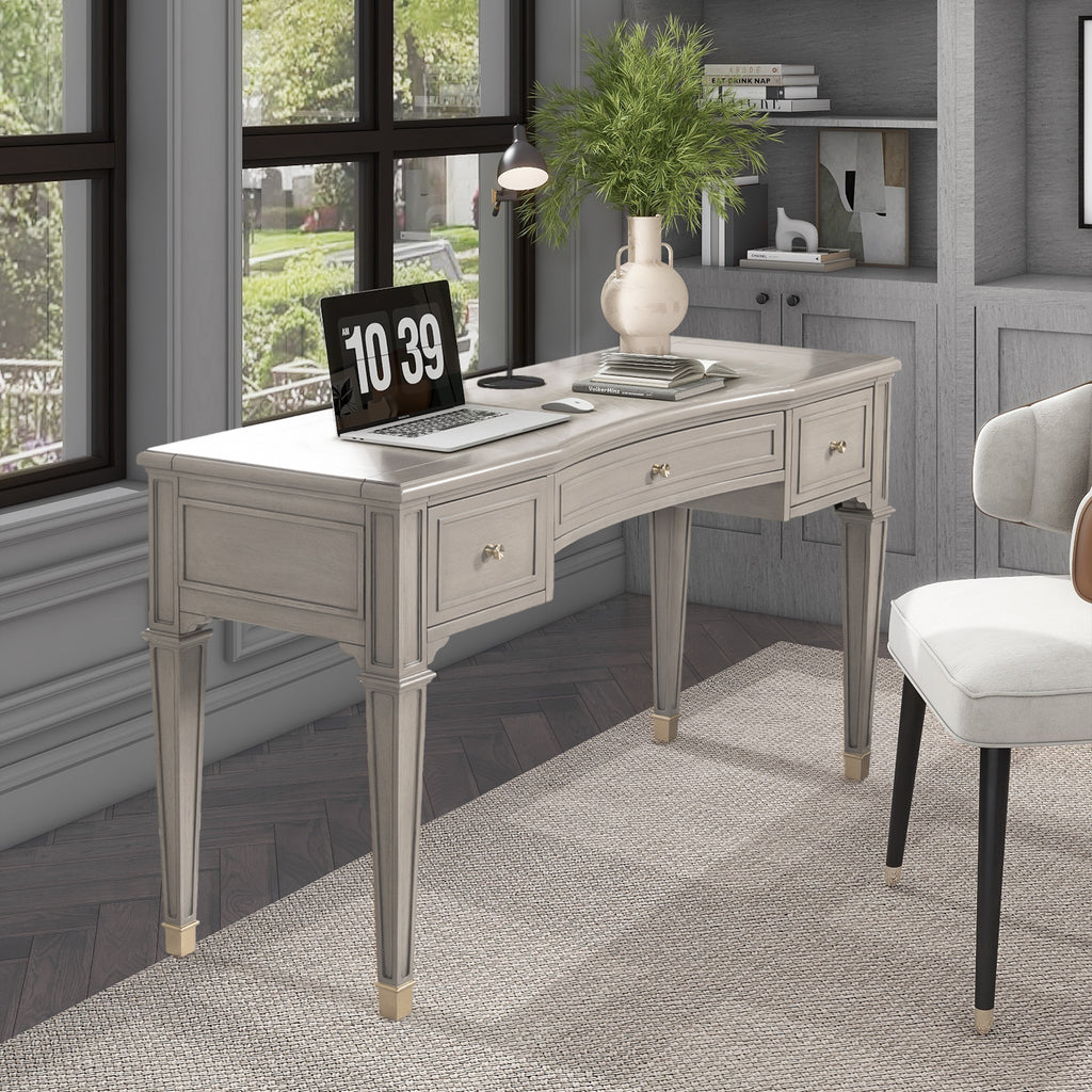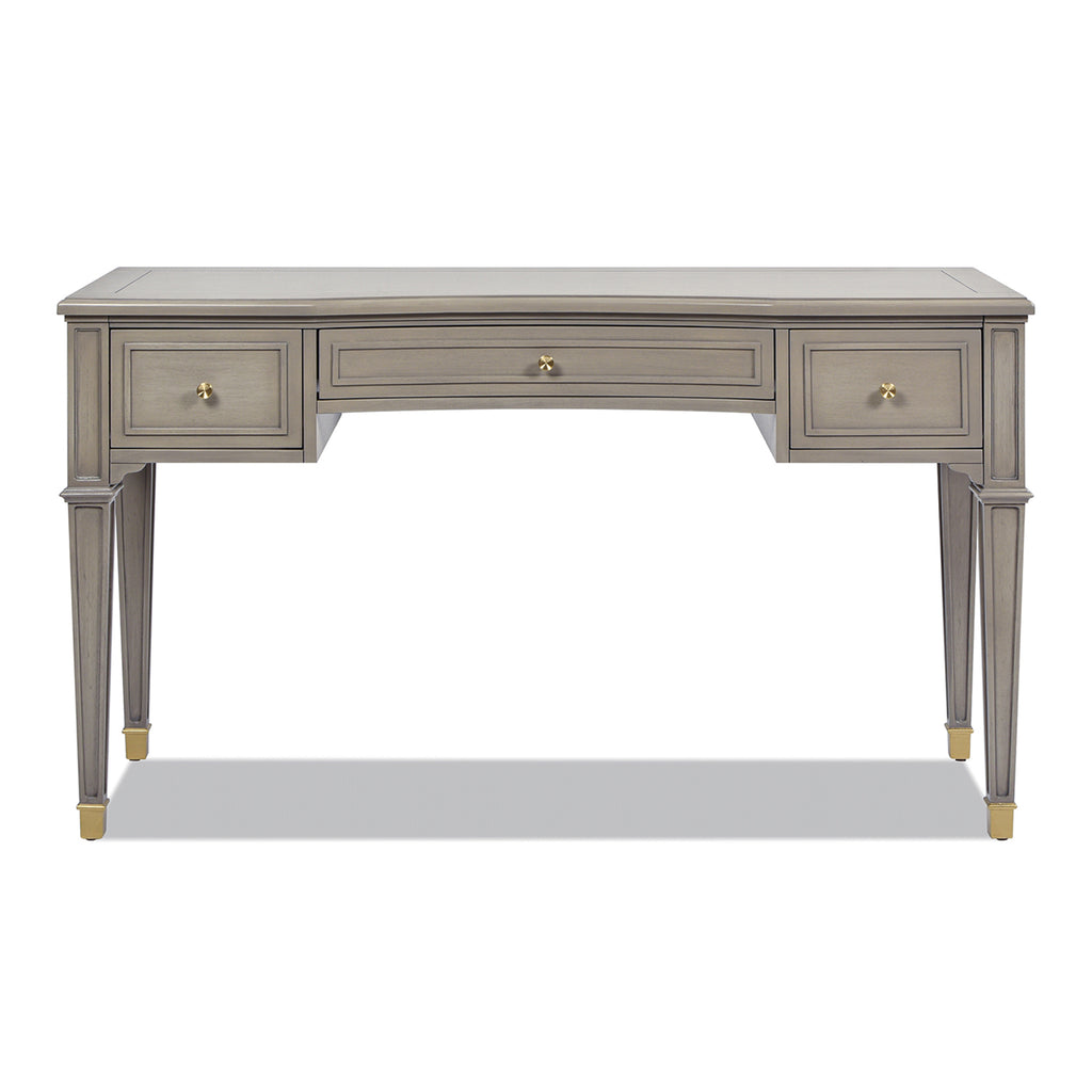 - Satin-gold drawer pulls complement the natural wood finish of the desk